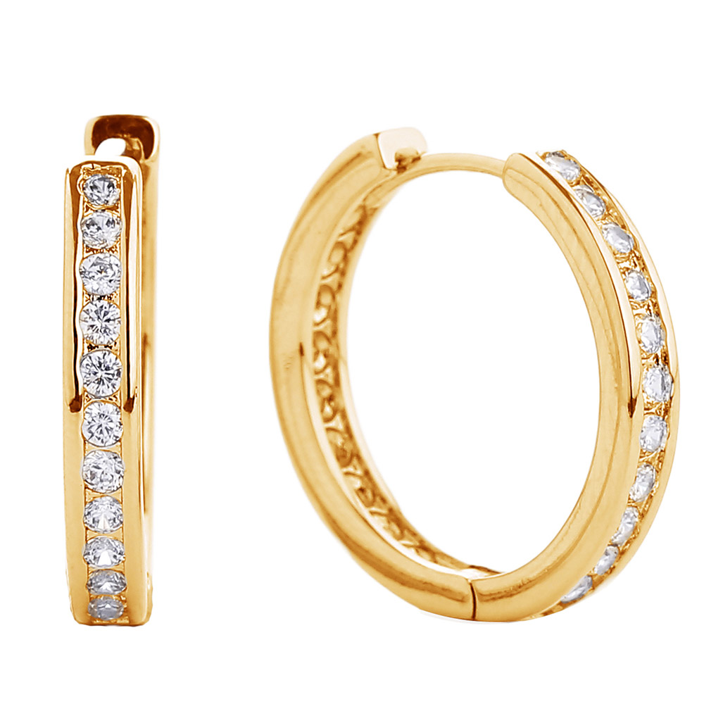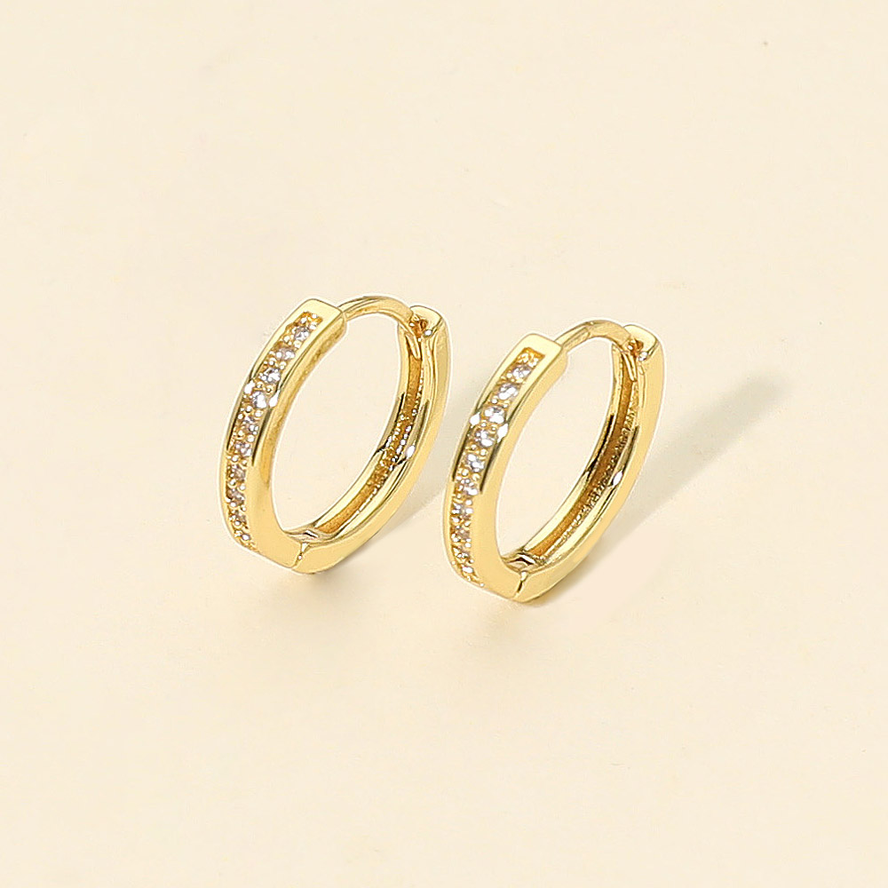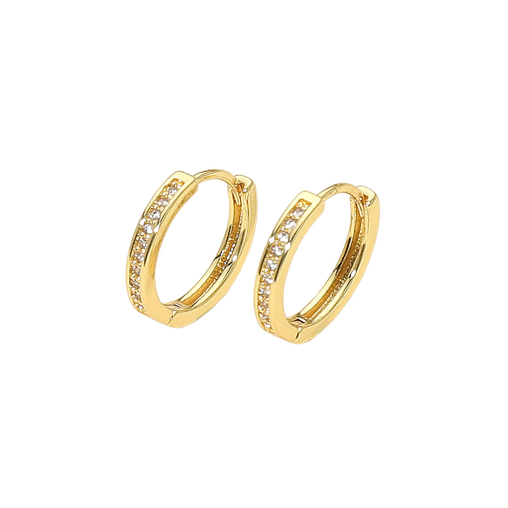 Details • Size : 0.6" X 0.6" • Huggie Back • Refined hoop earrings featuring a sleek design and delicate sparkling accents. Perfect for adding sophistication to both casual and formal looks, these earrings offer timeless elegance and effortless style for everyday wear or special occasions. • Brass • CZ Cubic Zirconia • Gold Dipped • Hypoallergenic • Lead and Nickel Compliant • Made In Korea