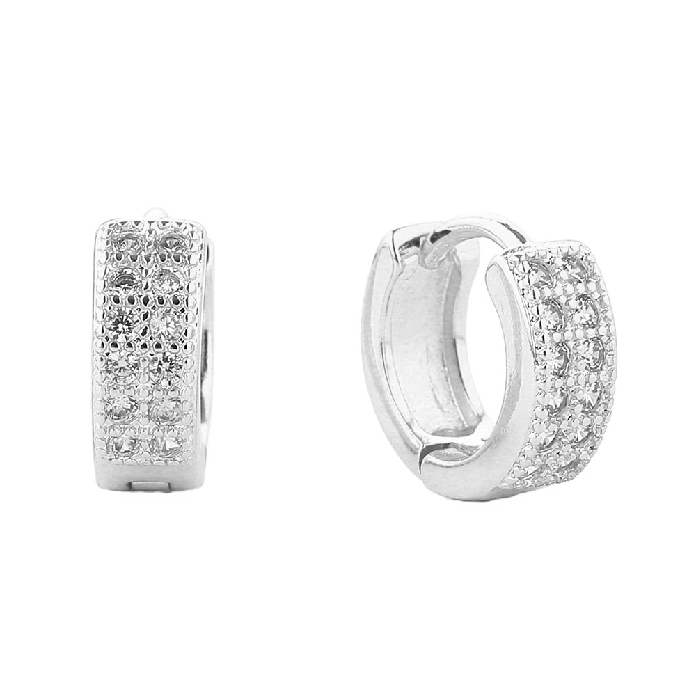 Details • Size : 0.4" X 0.4" X 0.2" • Huggie Back • Timeless hoop earrings featuring a refined pave design with shimmering accents. Perfect for elevating everyday style or complementing elegant looks, these earrings offer a balance of sophistication, sparkle, and versatile charm for any occasion. • Brass • CZ Cubic Zirconia • Gold Dipped • Hypoallergenic • Lead and Nickel Compliant • Made In Korea