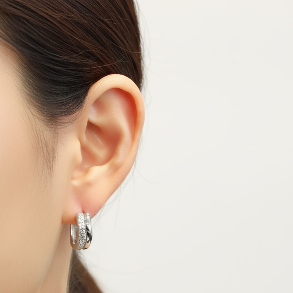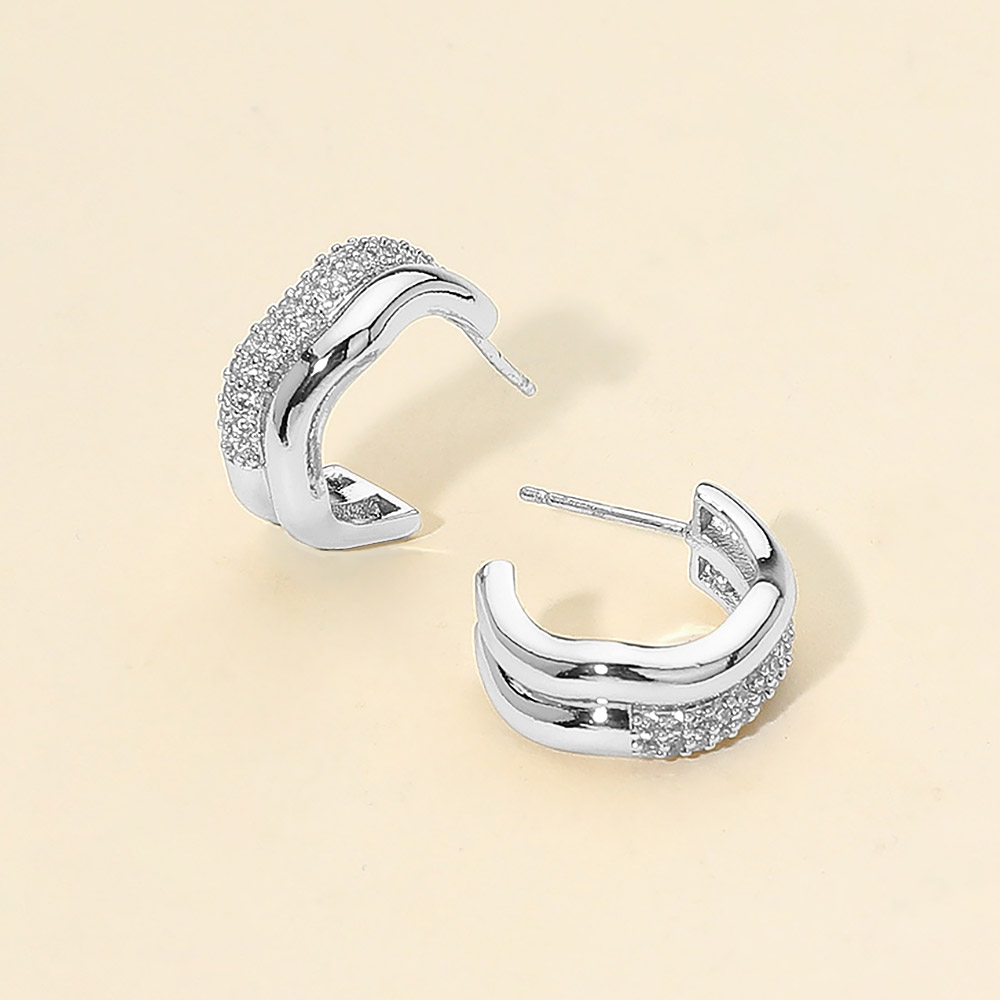 Details • Size : 0.6" X 0.7" X 0.25" • Huggie Back • Chic hoop earrings featuring a layered silhouette accented with shimmering pave details. A stylish blend of bold structure and refined sparkle, these earrings are perfect for elevating casual looks or adding polish to evening outfits. • Brass • CZ Cubic Zirconia • Gold Dipped • Hypoallergenic • Lead and Nickel Compliant • Made In Korea
