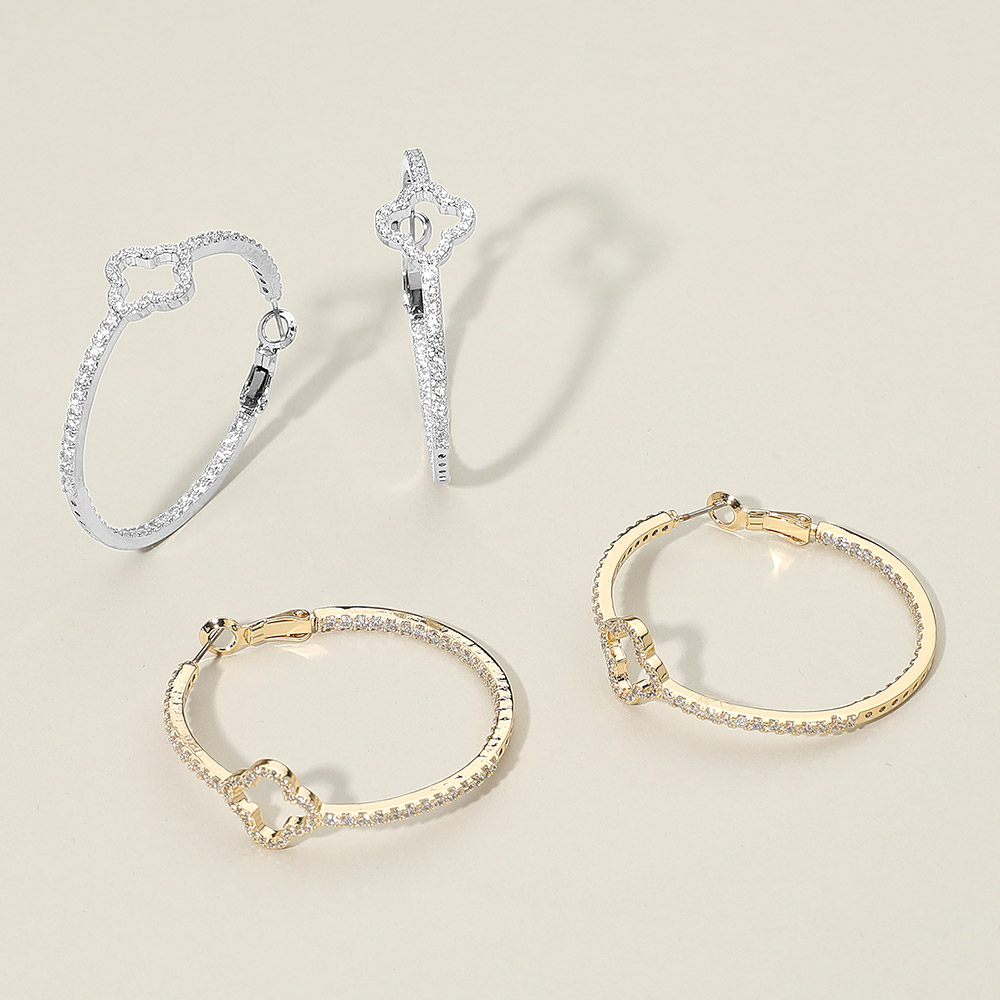 Details • Size : 1.6" X 1.6" X 0.5" • Omega Back • These elegant hoop earrings feature a delicate quatrefoil-shaped accent paired with a shimmering line of cz stones for added brilliance. Their refined silhouette offers a polished touch that enhances everyday outfits or special-occasion looks with effortless sophistication and charm. • CZ Cubic Zirconia • Gold Dipped