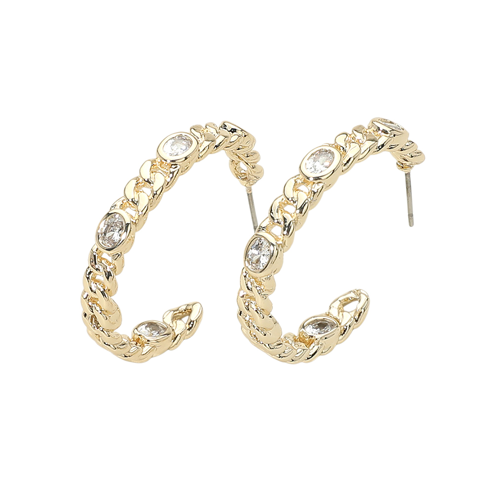 Details • Size : 1.2" X 1.2" X 0.2" • Post Back • Stylish chain-inspired hoop earrings accented with sparkling cz crystal details for a refined yet modern look. Designed to elevate everyday outfits or complement evening styles, these hoops offer a balanced mix of elegance and edge, making them a versatile choice for trend-forward accessory collections. • CZ Cubic Zirconia • Gold Dipped