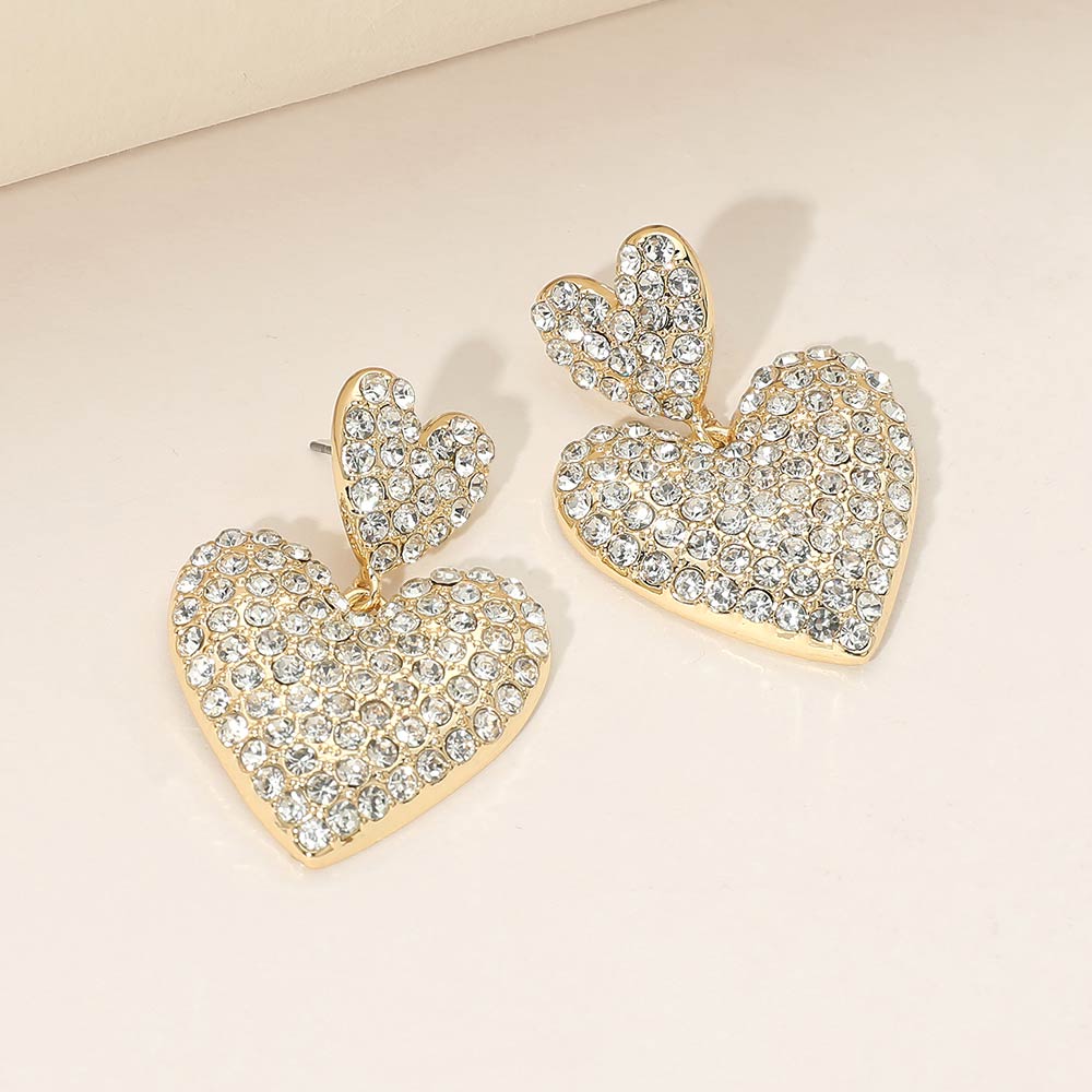 Details • Size : 1.25" X 1.75" • Post Back • These double heart drop stud earrings feature layered heart shapes detailed with sparkling crystal accents for an elegant statement look. Designed to add shine and dimension, they are perfect for everyday styling, romantic outfits, gifting moments, and boutique collections seeking eye-catching yet wearable heart-inspired jewelry. • Lead and Nickel Compliant • Gold Dipped