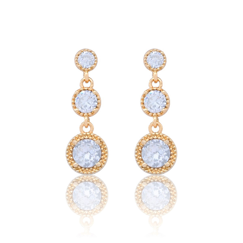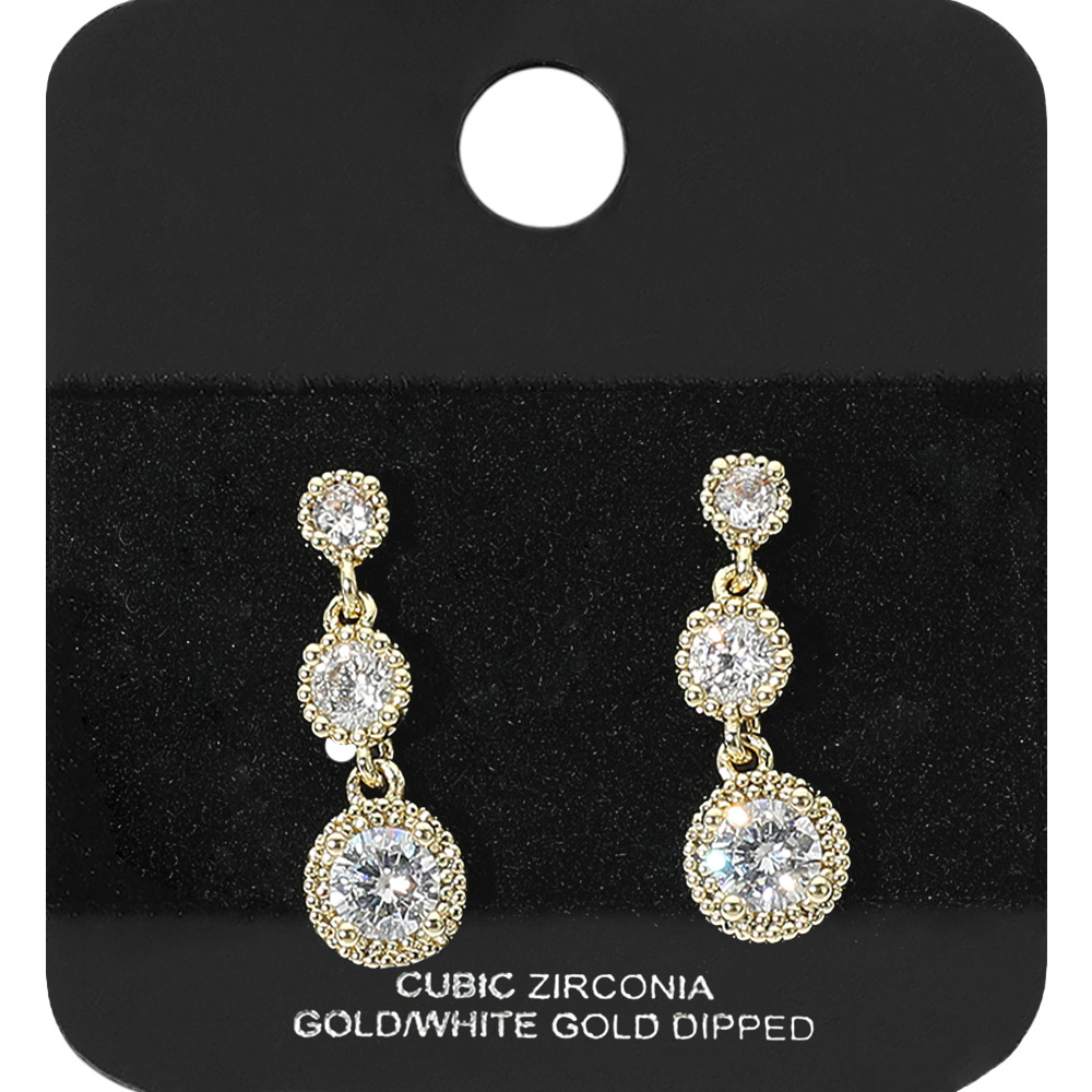 Details • Size : 0.6" X 0.8" • Post Back • Add timeless sophistication to your look with these triple stone drop earrings. Featuring three graduated stones framed in delicate detailing, they offer graceful movement and radiant sparkle, making them the perfect accessory for special occasions or everyday elegance. • CZ Cubic Zirconia • Gold Dipped • Lead and Nickel Compliant