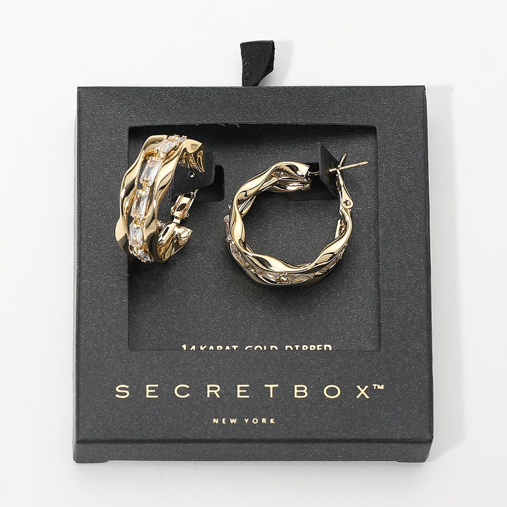 SECRET BOX_14K Gold Dipped Baguette Stone Embellished Twisted Hoop Earrings