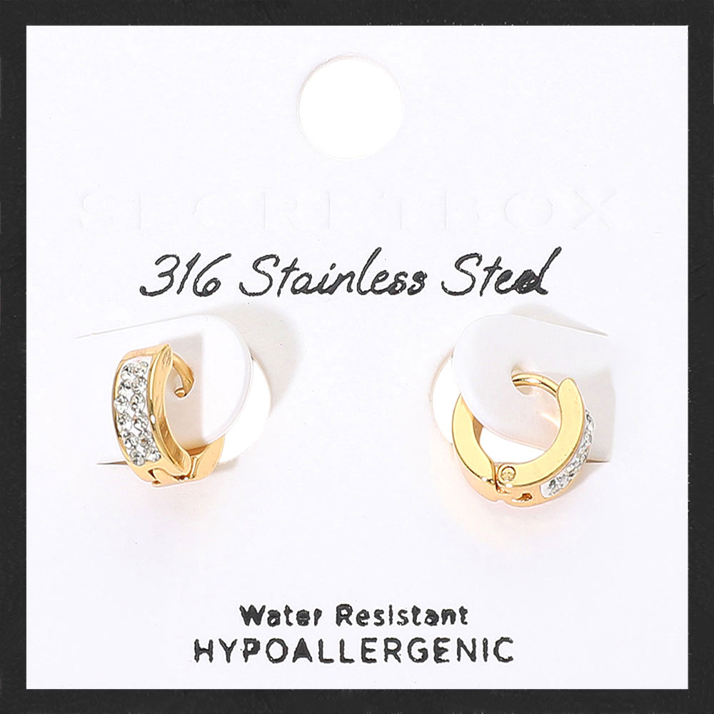 Details • Size : 0.4" X 0.4" X 0.2" • Huggie Back • A polished pair of small hoop earrings featuring a sleek design highlighted with sparkling stone accents. Water-resistant and hypoallergenic, they offer comfortable daily wear and timeless shine. Perfect for elevating casual outfits or adding subtle elegance to dressy styles. • Water Resistant • Hypoallergenic • Stainless Steel