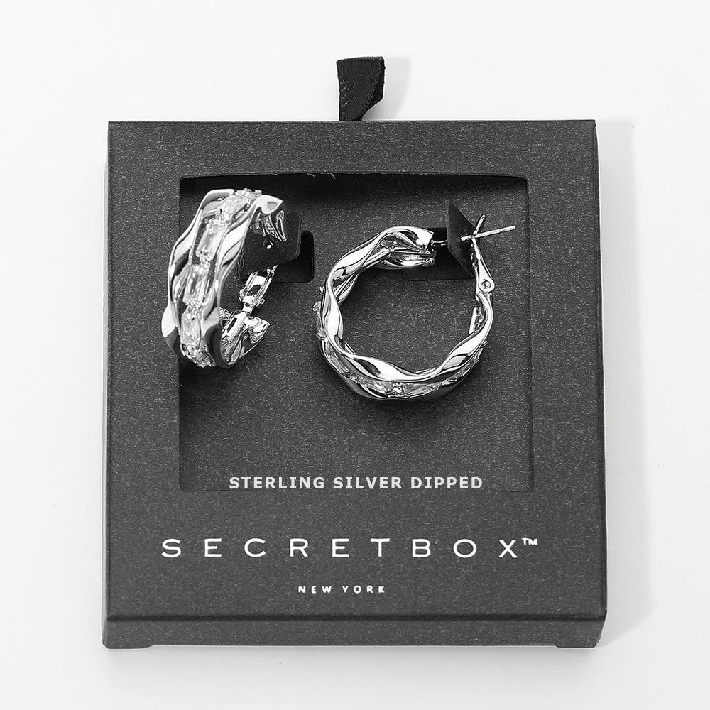 Details • Size : 1" X 1" X 0.4" • Post Back • Elegant twisted hoop earrings featuring a sterling silver dipped finish and sparkling crystal accents. Perfect for adding sophistication to everyday or evening looks, these timeless earrings bring modern shine and graceful style to any jewelry collection. • Sterling Silver Dipped