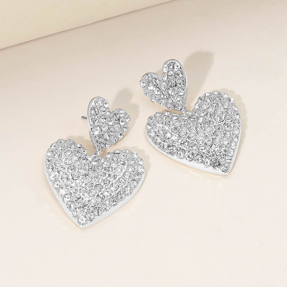 Silver Dipped Rhinestone Pave Double Heart Link Drop Earrings Silver Dipped Rhinestone Pave Double Heart Link Drop Earrings