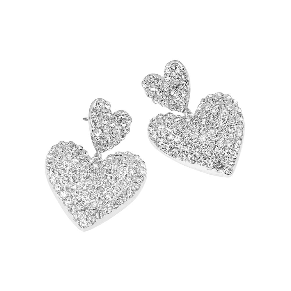 Silver Dipped Rhinestone Pave Double Heart Link Drop Earrings