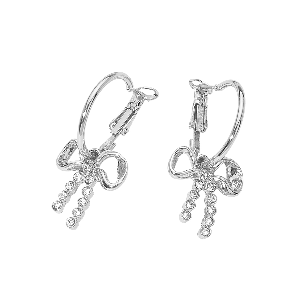 Details • Size : 1.25" L • Omega Back • Charming bow-shaped hoop earrings accented with sparkling details for a playful yet elegant look. Designed with a secure clasp for comfortable wear. Ideal for everyday styling, gifting, boutiques, and seasonal displays. A versatile accessory that adds a feminine touch to any outfit. • Sterling Silver Dipped • Lead and Nickel Compliant