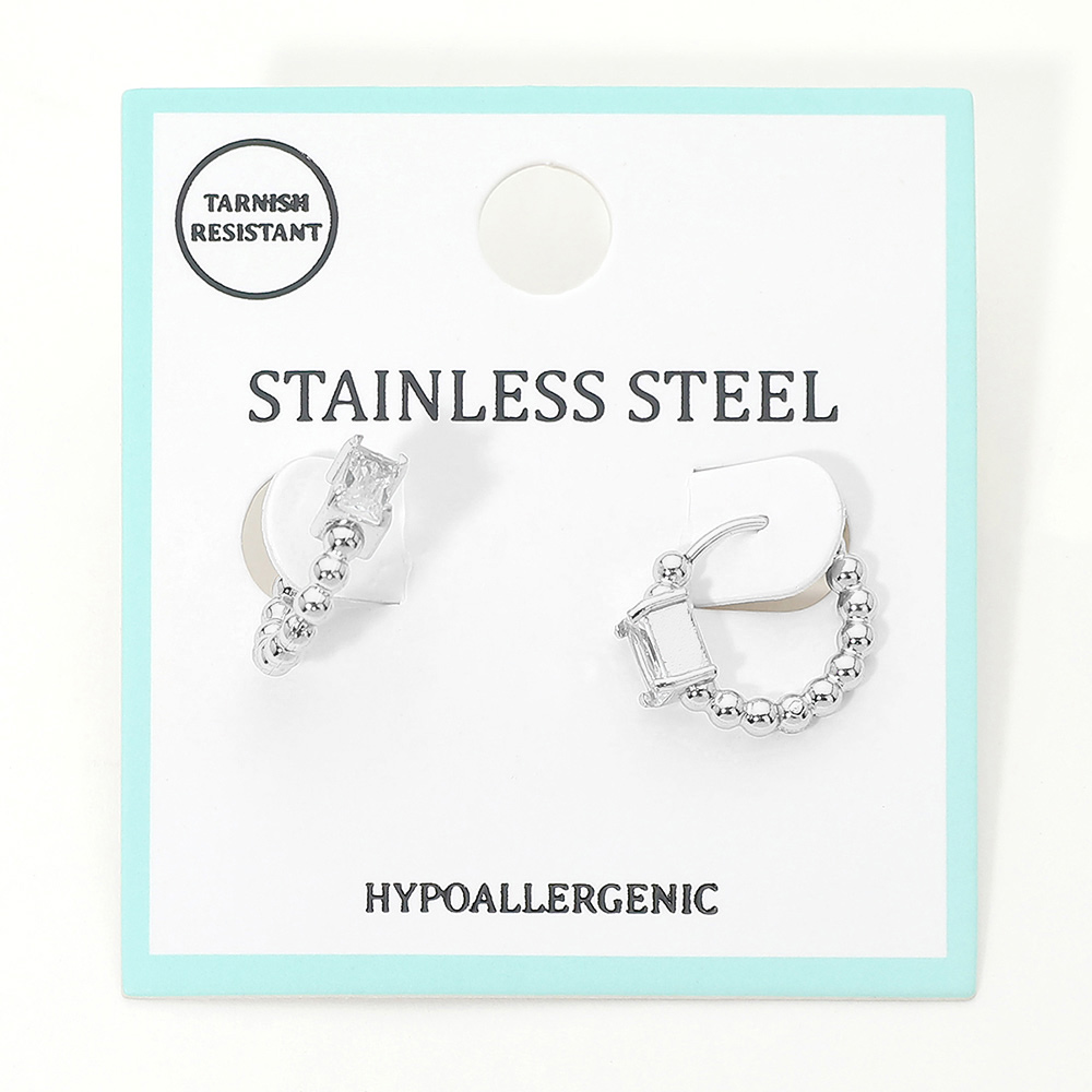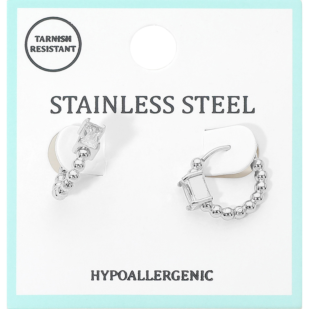 Stainless Steel Rectangular Stone Accent Beaded Mini Huggie Hoop Earrings