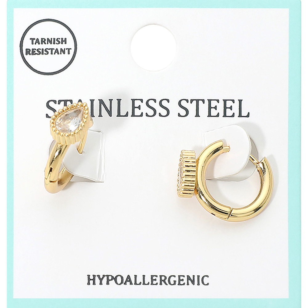 Details • Size : 0.6" X 0.6" X 0.25" • Huggie Back • Tarnish Resistant • Elegant huggie hoop earrings featuring a teardrop-shaped accent that adds refined sparkle to a clean, modern silhouette. Designed for comfortable daily wear, this versatile style works effortlessly for casual looks, special occasions, gifting, and boutique jewelry assortments. • Hypoallergenic • Stainless Steel