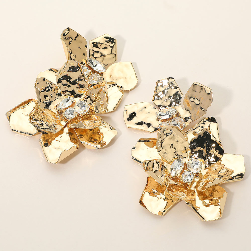 Details • Size : 2.5" X 3.5" • Post Back • These hammered metal floral statement earrings showcase a bold, sculptural design with textured petals and sparkling crystal accents. Their eye-catching style adds glamour and sophistication, making them a perfect accessory for weddings, parties, or standout everyday looks. • Lead and Nickel Compliant