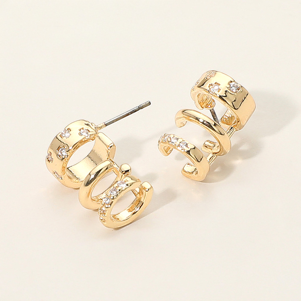 Details • Size : 0.4" X 0.6" • Post Back • Trendy ear cuff earrings featuring a stacked triple hoop design accented with sparkling crystals. A versatile and modern accessory that adds bold elegance to casual looks, parties, and evening outfits. • Brass • Lead and Nickel Compliant