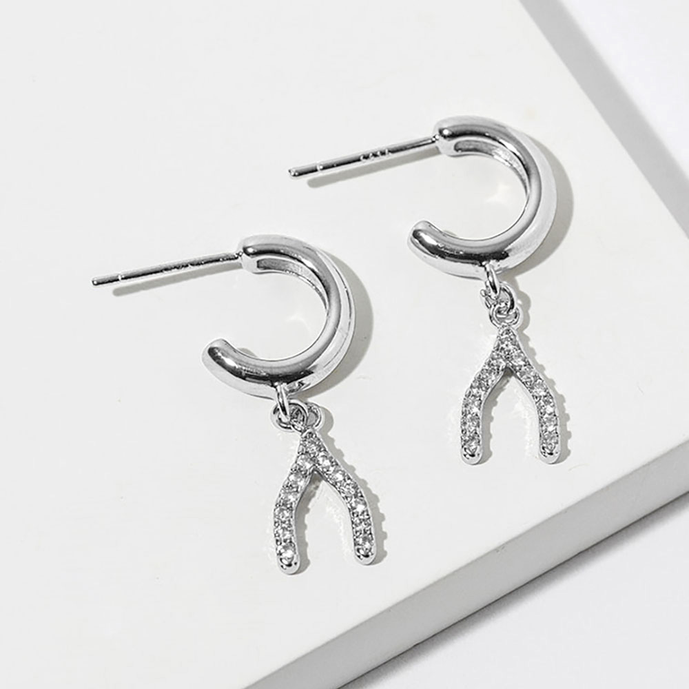 Details • Size : 0.5" X 1" • Modern crescent hoop drop earrings featuring a sleek curved hoop paired with a sparkling CZ-style wishbone accent. Designed for everyday wear or elevated styling, these earrings offer subtle shine, graceful movement, and a versatile silhouette ideal for boutiques and curated accessory collections. • CZ Cubic Zirconia • Gold Dipped • Lead and Nickel Compliant • Made In Korea • Sterling Silver Post