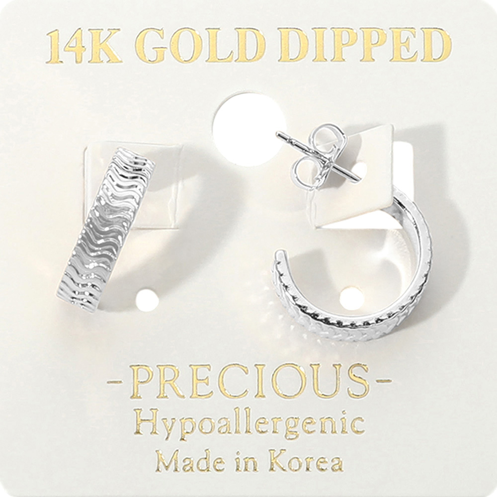 Details • Size : 0.6" X 0.6" • Post Back • These hoop earrings showcase a textured wave pattern that adds movement and visual interest to a classic shape. A chic choice for enhancing everyday style or completing a refined ensemble. • Lead and Nickel Compliant • Hypoallergenic • Made In Korea • Gold Dipped