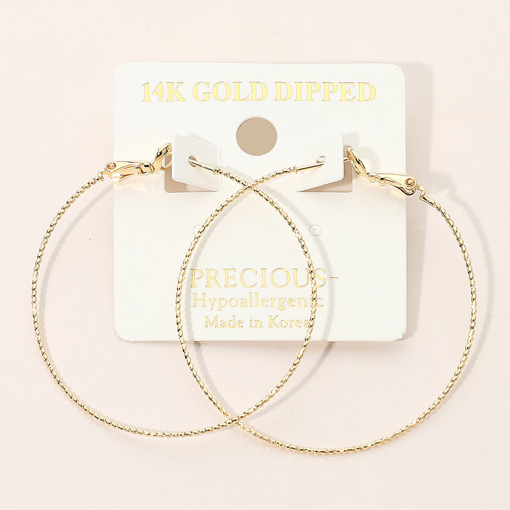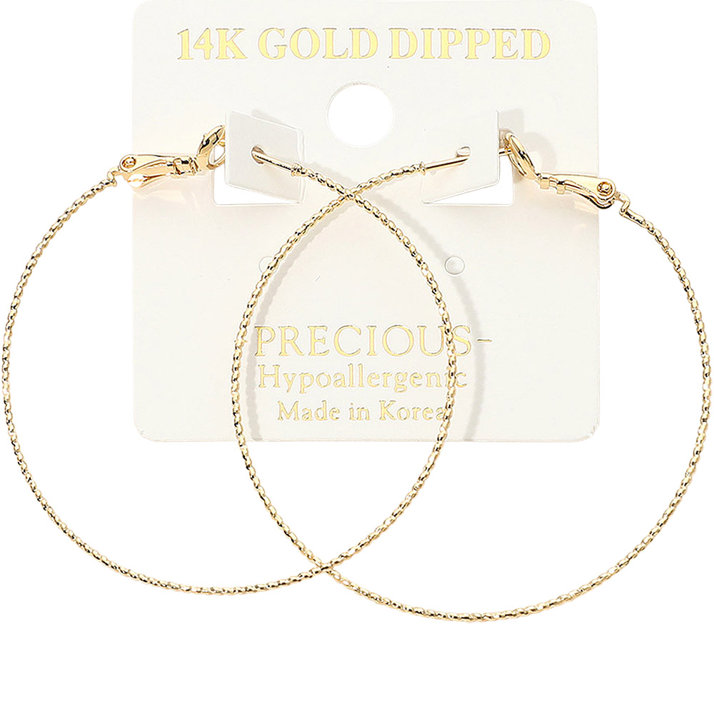 Details • Size : 2" X 2" • Omega Back • Lightweight hoop earrings featuring a thin, textured surface for a stylish statement. Designed for comfort and elegance, these hoops are perfect for daily wear or special events. An easy match for casual and dressy looks alike. • Hypoallergenic • Made In Korea • Gold Dipped