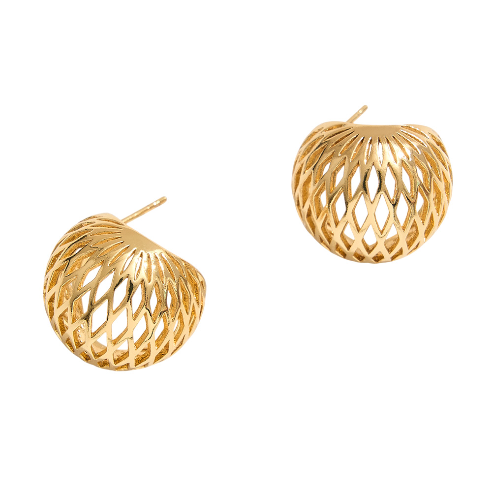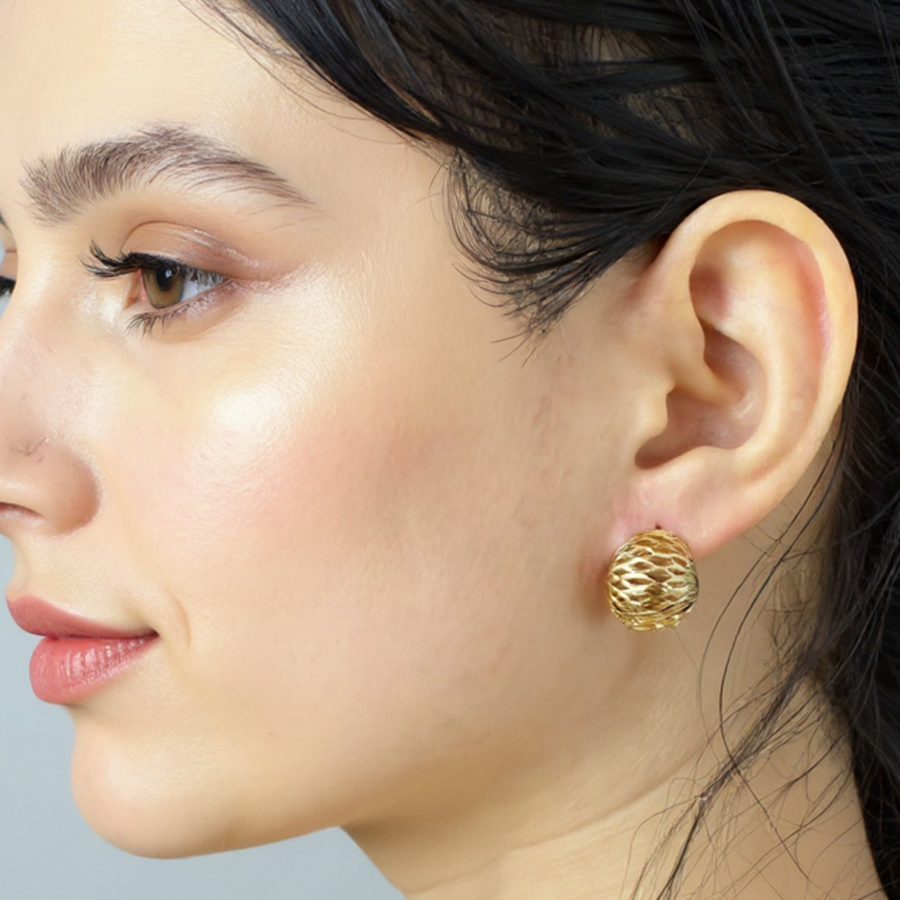 Details • Size : 0.75" X 0.75" • Post Back • Stylish cutout dome stud earrings featuring a textured open lattice design that blends bold structure with lightweight comfort. Perfect for adding a touch of modern elegance to casual or dressy looks, these earrings stand out as a versatile accessory in any jewelry collection. • Brass • Gold Dipped • Hypoallergenic • Lead and Nickel Compliant • Made In Korea