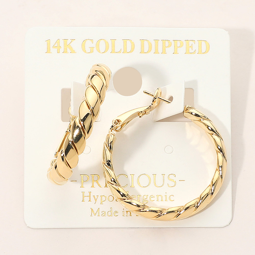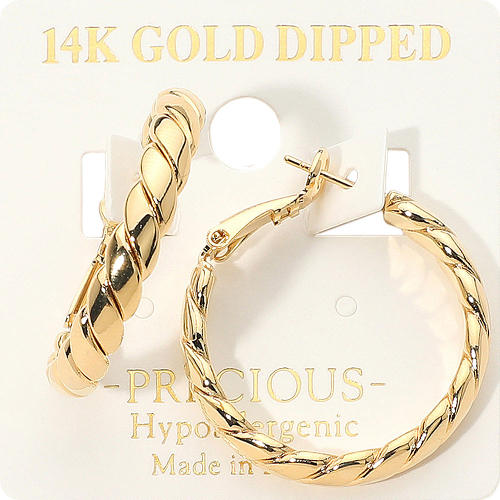 Details • Size : 1.2" X 1.2" • Omega Back • Refine your everyday look with these twisted hoop earrings featuring a sleek braided design for subtle texture and shine. Lightweight and comfortable for all-day wear, they complement casual outfits or dressy ensembles with effortless elegance, making them a versatile accessory or thoughtful gift choice. • Gold Dipped • Hypoallergenic • Made In Korea