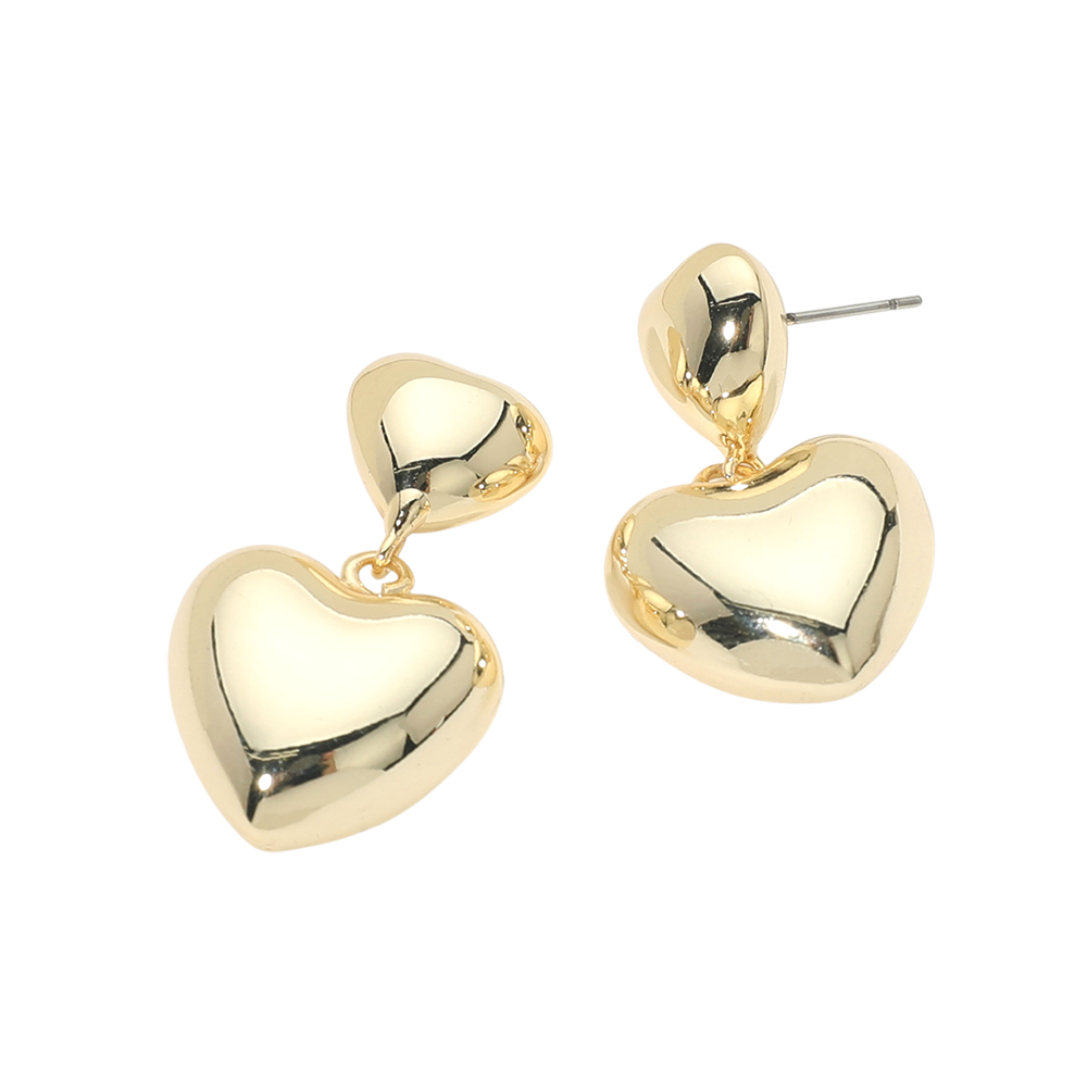 Details • Size : 0.75" X 1.25" • Post Back • These double heart drop earrings showcase a softly sculpted layered heart design with smooth curves and elegant movement. Created to stand out, they add a romantic statement to everyday outfits or special occasions, making them a versatile accessory for gifting, celebrations, and modern feminine styling. • Gold Dipped