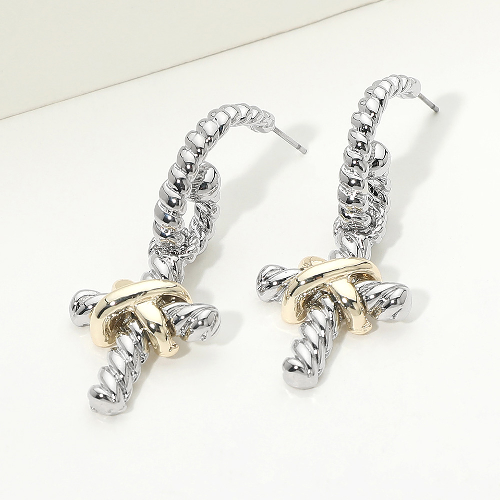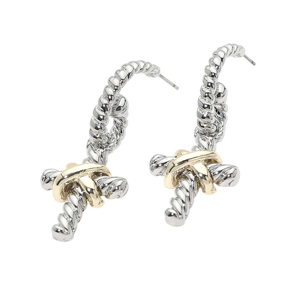 Details • Size : 0.75" X 1.75" • Post Back • These twisted crisscross hoop earrings feature a bold rope-inspired silhouette accented with a sculptural knot detail for modern edge. Designed to elevate everyday looks or special outfits, they deliver standout style with balanced movement, making them ideal for fashion-forward styling, gifting, and trend-driven collections. • Gold Dipped