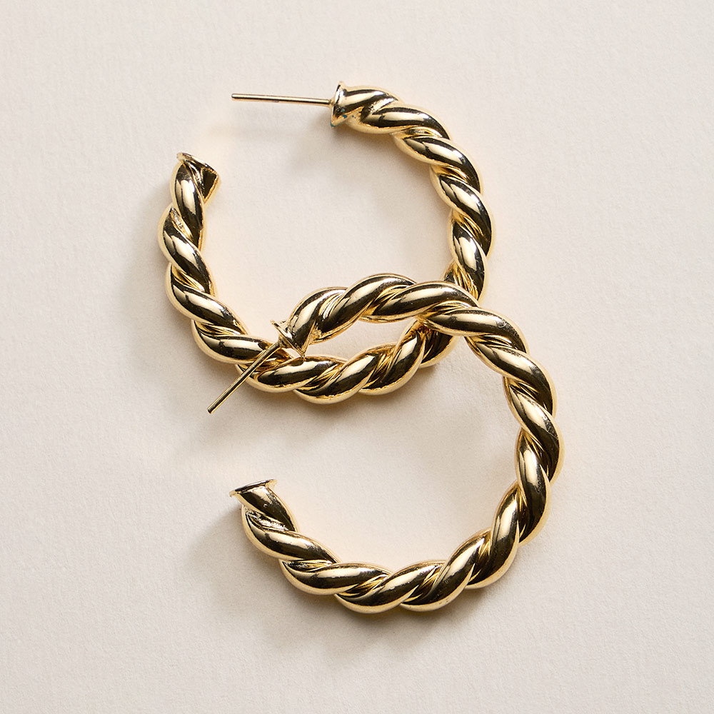 Details • Size : 1.5" X 1.5" X 0.25" • Post Back • Bold twisted hoop earrings featuring a rope-inspired design that adds texture and movement to any outfit. A timeless silhouette with a modern edge, perfect for everyday wear or elevated styling, ideal for gifting, layering, or making a confident statement with effortless versatility. • Lead and Nickel Compliant • Hypoallergenic • Gold Filled • Made In Brazil