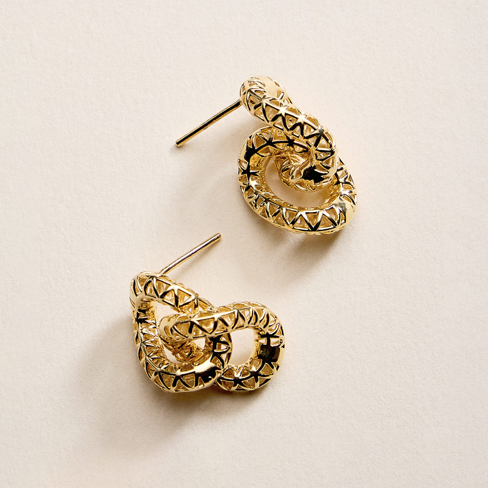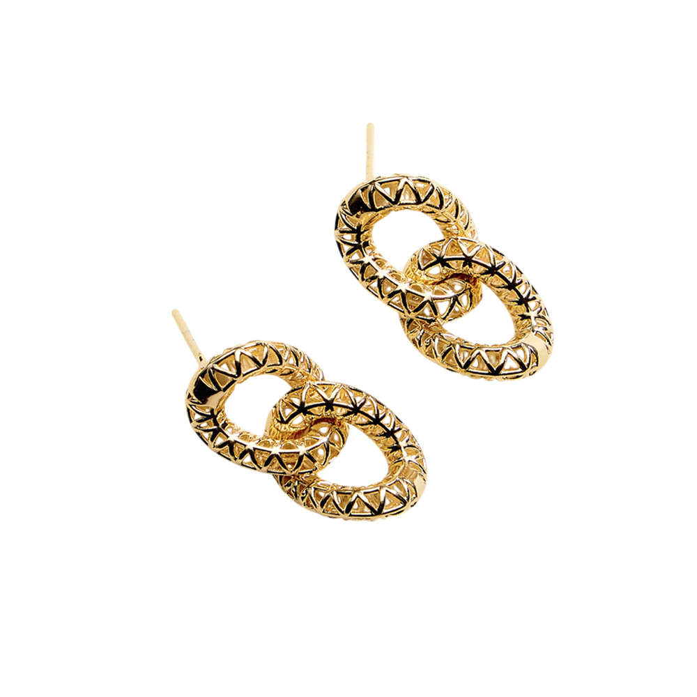 Details • Size : 0.6" X 1" • Post Back • Textured double link hoop earrings designed with an interlocking silhouette for a bold yet refined statement. The sculpted surface adds visual depth while maintaining a clean, modern look. Lightweight and easy to style, these earrings transition effortlessly from everyday outfits to elevated occasions, making them a versatile addition to curated jewelry collections and gift-ready assortments. • Gold Filled • Hypoallergenic • Lead and Nickel Compliant • Made In Brazil
