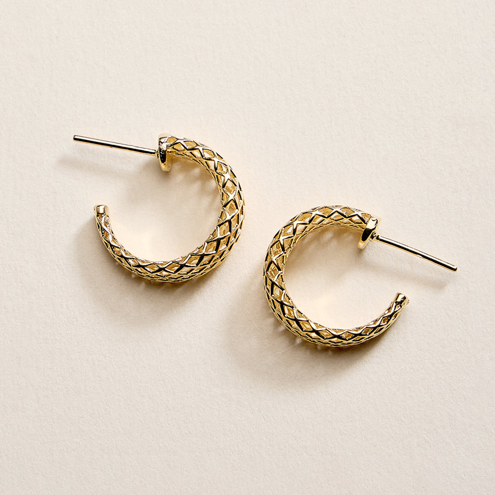 Details • Size : 0.75" X 0.75" X 0.25" • Post Back • Textured small curved hoop earrings designed with an intricate patterned surface that adds depth and visual interest. The compact size makes them ideal for everyday wear while still offering a polished statement. Easy to pair with casual or elevated looks, these hoops are perfect for layering, gifting, and versatile jewelry collections. • Gold Filled • Hypoallergenic • Lead and Nickel Compliant • Made In Brazil