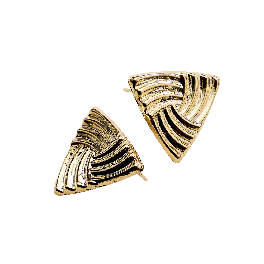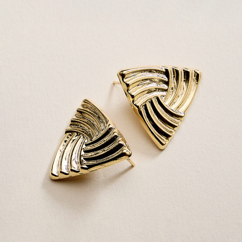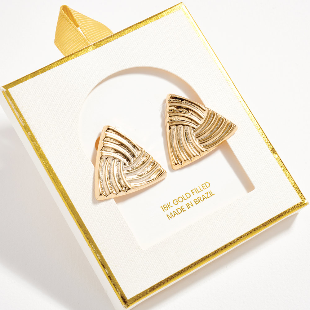 Details • Size : 1.1" X 1" • Post Back • Modern triangle stud earrings featuring a sculpted, textured surface that adds depth and visual interest. Designed for effortless everyday wear, these geometric studs offer a clean, contemporary look that pairs well with casual outfits or polished styles, making them a versatile gift option. • Gold Filled • Hypoallergenic • Lead and Nickel Compliant • Made In Brazil