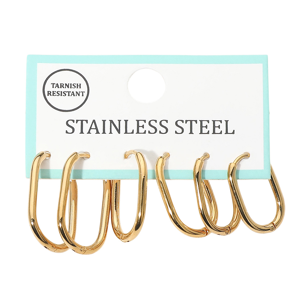 Details • Size : 0.75" - 1" L • Huggie Back • Classic three-pair oval hoop earring set designed for versatile, everyday styling. Featuring smooth, elongated silhouettes in graduated sizes, this timeless set is perfect for mixing and matching across multiple piercings. An effortless choice for daily wear, layering, or gifting. • Lead and Nickel Compliant • Stainless Steel