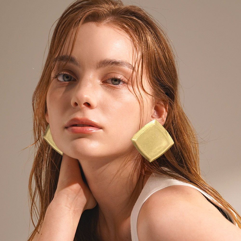 Details • Size : 2.5" X 2.5" • Post Back • Chic square stud earrings with a textured finish and bold geometric shape. These statement earrings offer a modern sculptural look, adding a touch of contemporary sophistication to any outfit, perfect for both casual styling and elegant occasions. • Lead and Nickel Compliant