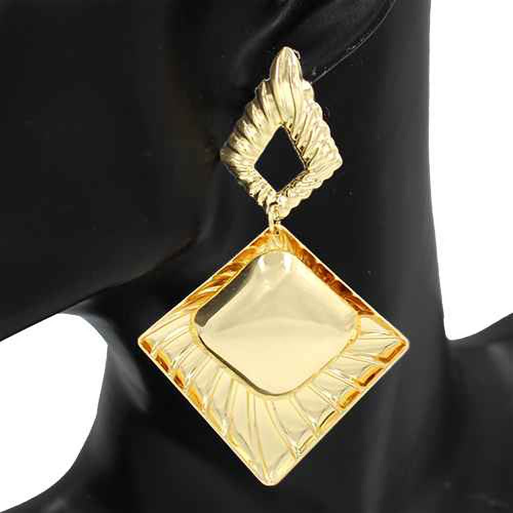 Details • Size : 2" X 3.5" • Post Back • These geometric drop earrings feature a sculpted metal design with layered texture and a bold diamond silhouette. Created to elevate everyday and occasion looks, they offer statement appeal without heaviness, making them an easy choice for modern styling, travel wear, and curated accessory collections. • Lead and Nickel Compliant