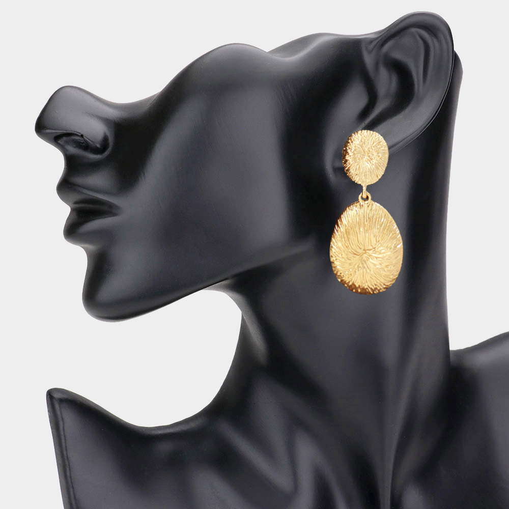 Details • Size : 1" X 2.2" • Post Back • Elevate any look with these textured disc drop earrings featuring a bold, sculptural silhouette that adds modern artistic flair. Their dimensional design creates eye-catching movement, making them a standout accessory perfect for both everyday outfits and elevated occasions. • Lead and Nickel Compliant