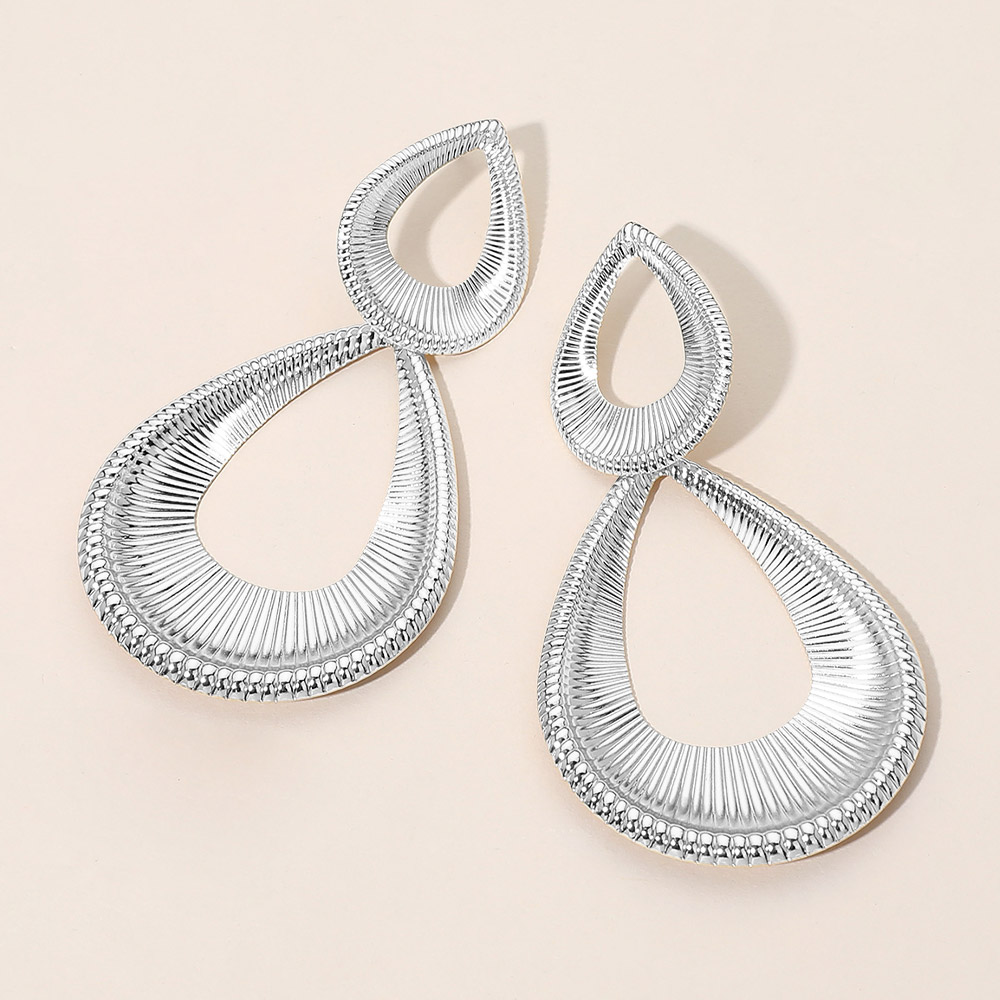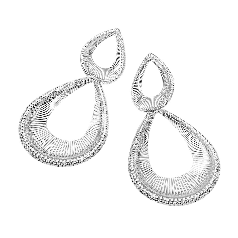 Details • Size : 1.75" X 3.25" • Post Back • Elegant double teardrop drop earrings featuring an airy open design with fine linear texture for added depth and movement. These statement earrings create a lightweight yet bold look, perfect for elevating everyday outfits, office wear, or special occasion styling. Ideal for customers seeking modern drop earrings with sculptural detail and refined visual interest. • Lead and Nickel Compliant