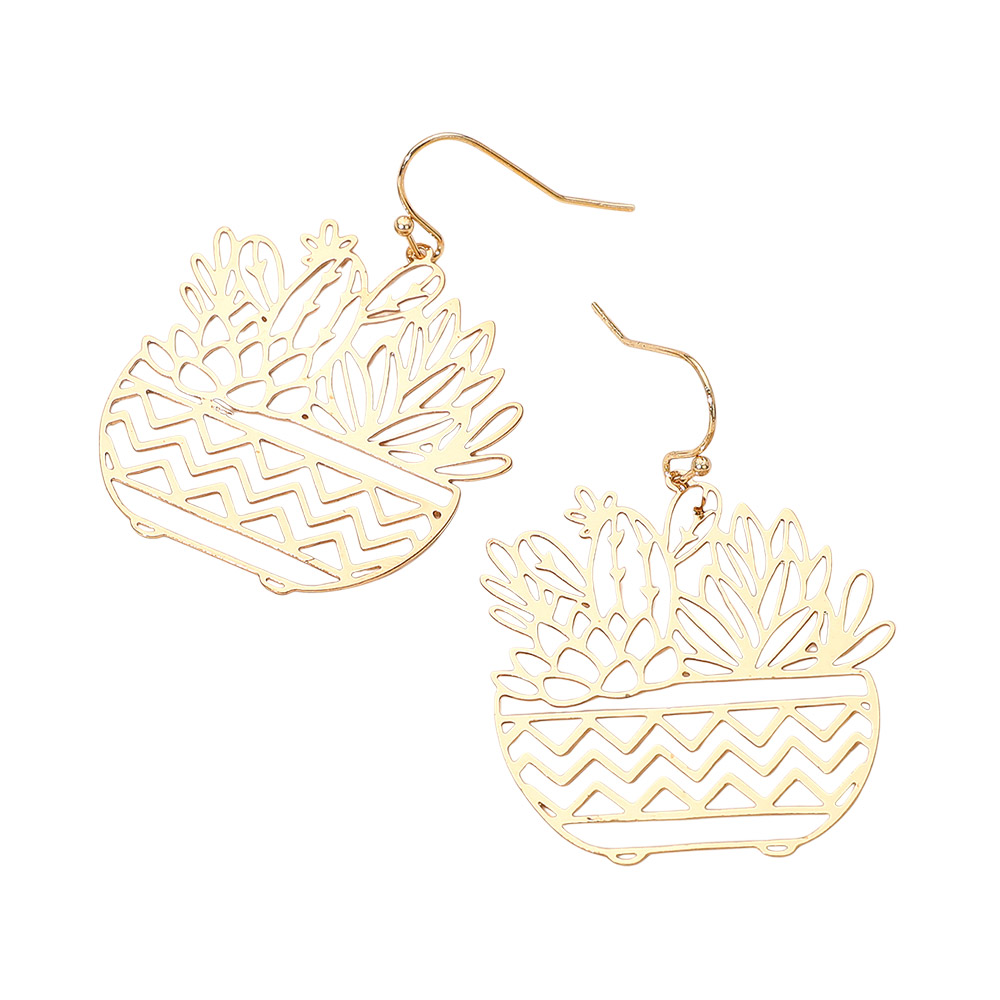 Brass Metal Botanical Planter Cutout Dangle Earrings