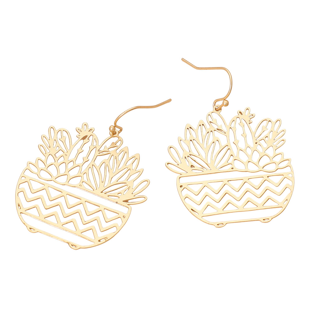 Brass Metal Botanical Planter Cutout Dangle Earrings