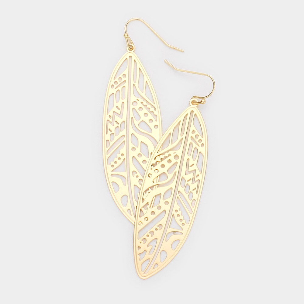 Brass Metal Filigree Tropical Leaf Dangle Earrings