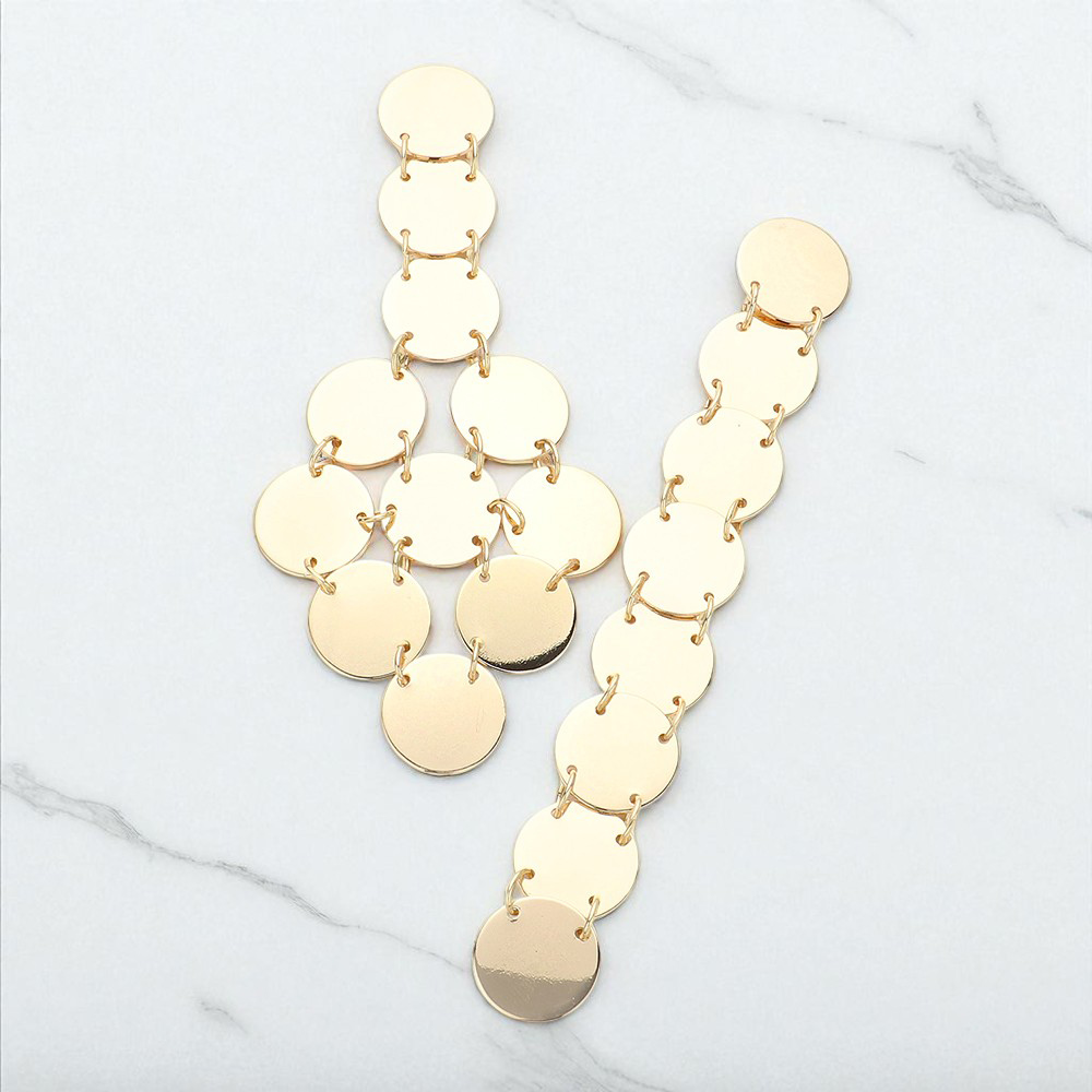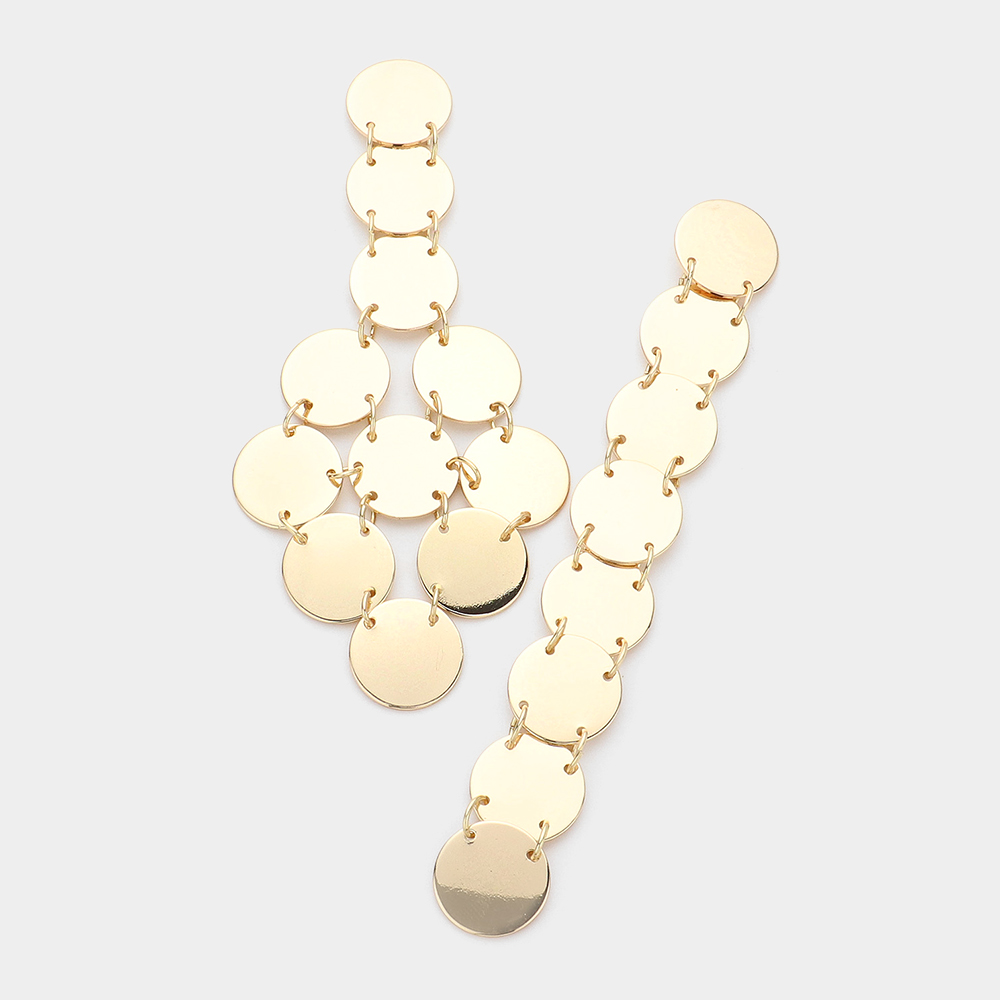 Details • Size : 0.7" X 4.75", 1.75" X 4.1" • Post Back • These geometric disc statement drop earrings feature cascading polished discs that create bold movement and shine. A modern yet versatile design, perfect for elevating both casual and dressy looks. Lightweight and eye-catching, they add a contemporary edge to any outfit. • Lead and Nickel Compliant