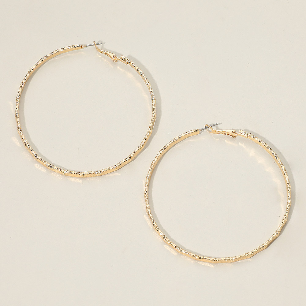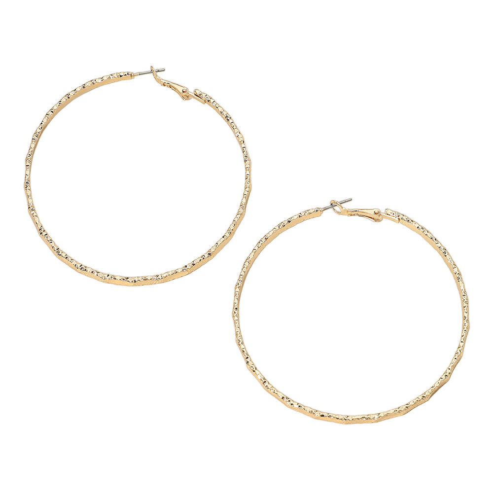 • Elegant large textured hoop earrings featuring a subtle hammered-style finish for added shine and dimension. Lightweight and easy to wear with a secure latch-back closure, perfect for elevating everyday outfits or adding a stylish touch to dressy looks.