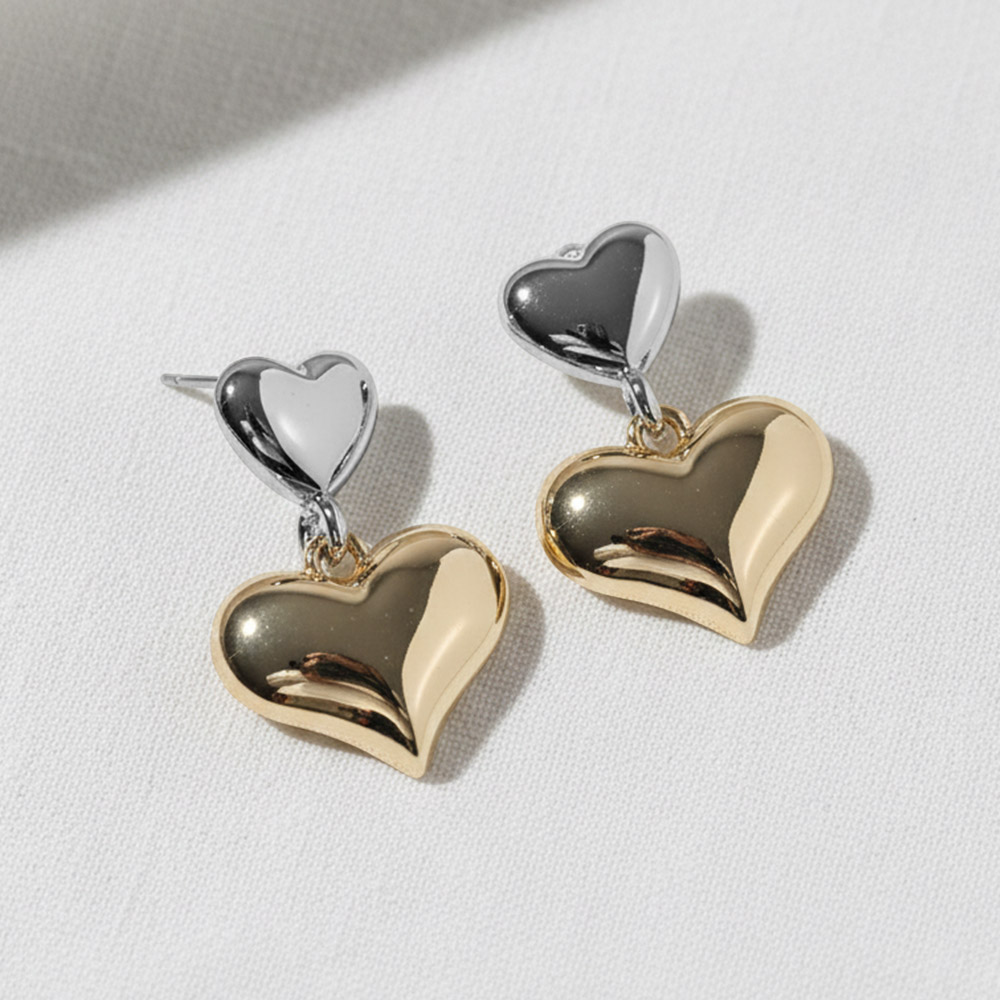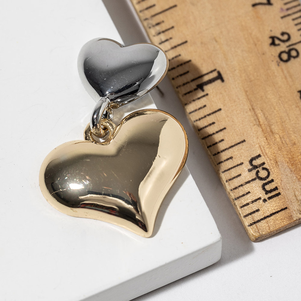 Details • Size : 0.8" X 1.3" • Double heart drop earrings designed with a sleek layered silhouette that adds dimension and shine. This romantic yet modern style offers effortless movement and visual impact, making it ideal for everyday wear, giftable assortments, and seasonal collections across boutiques and online stores. • Gold Dipped • Lead and Nickel Compliant • Made In Korea • Sterling Silver Post