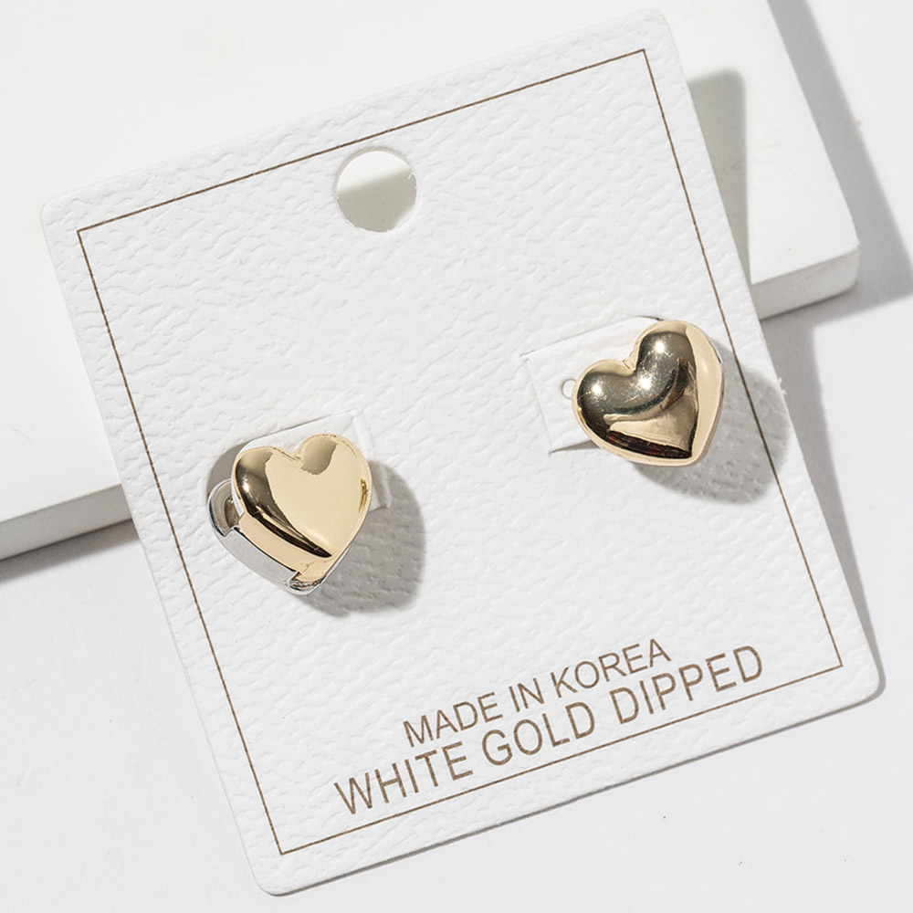Details • Size : 0.5" X 0.5" • Huggie Back • Classic heart stud earrings designed with a smooth, sculpted shape that adds a polished touch to any jewelry collection. This timeless style works beautifully for everyday wear, romantic gifting, and seasonal assortments, offering versatile appeal that pairs effortlessly with casual looks and elegant outfits alike. • Lead and Nickel Compliant • Made In Korea • Gold Dipped