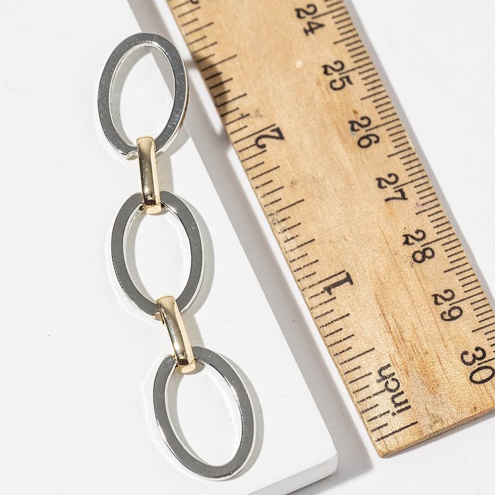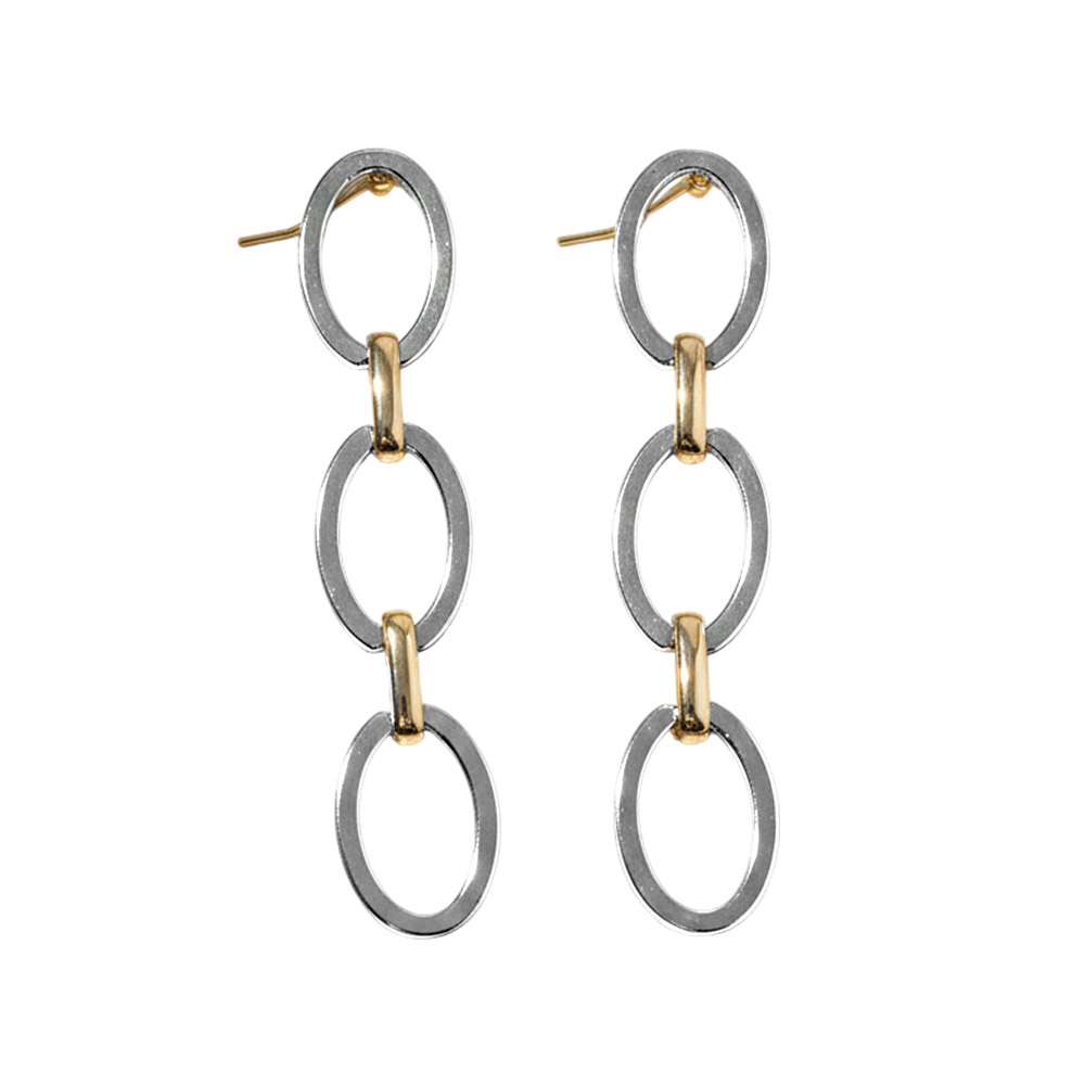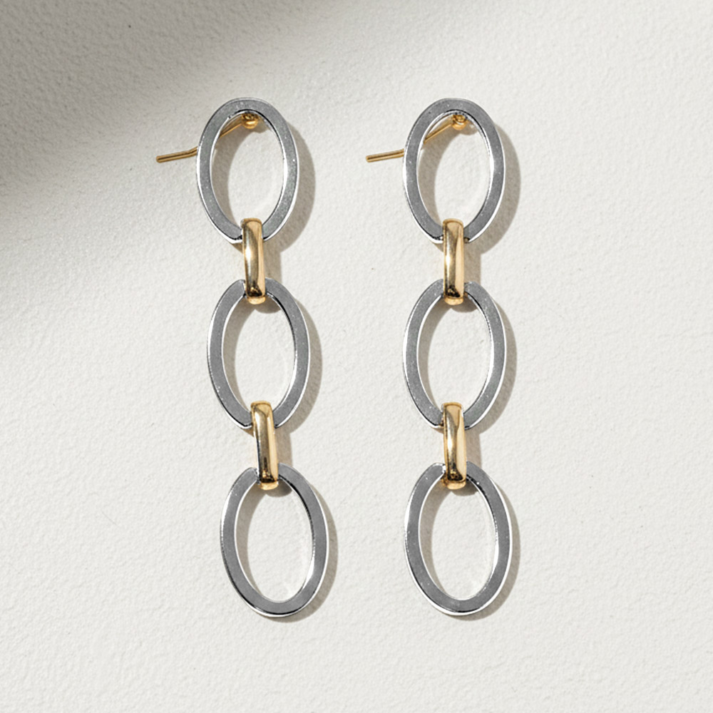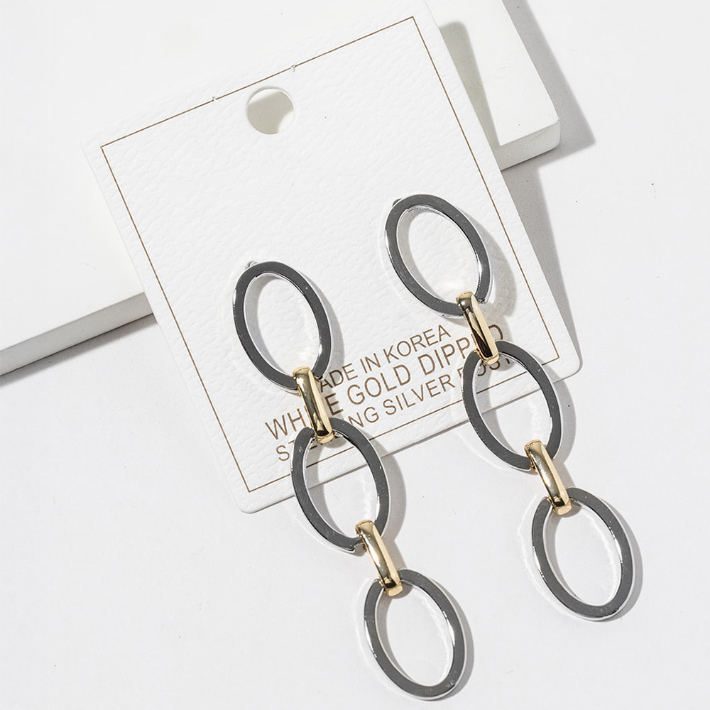Details • Size : 0.5" X 2.75" • Linked oval drop earrings featuring a clean chain-inspired silhouette that creates fluid movement and a bold yet refined look. This versatile design transitions easily from casual styling to elevated outfits, making it a strong choice for curated jewelry assortments, gifting displays, and trend-focused collections. • Lead and Nickel Compliant • Made In Korea • Gold Dipped • Sterling Silver Post