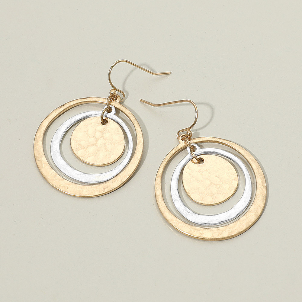 Details • Size : 1.3" X 1.8" • Fish Hook Back • Stylish hammered circle drop earrings with a layered open ring design. Lightweight and versatile, perfect for adding a modern boho touch to casual or dressy outfits. Great for everyday wear or gifting. • Lead and Nickel Compliant