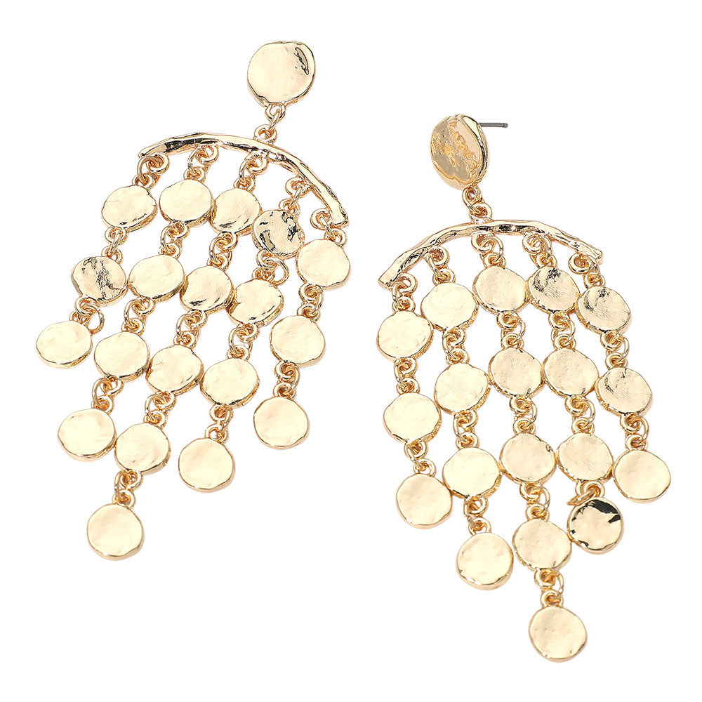 Details • Size : 1.4" X 3.75" • Post Back • Disc cascade chandelier earrings showcase layered dangling discs that create fluid movement and striking visual texture. The airy tiered design adds bold elegance to everyday outfits or evening looks, delivering dramatic shine and statement style without sacrificing versatility. • Lead and Nickel Compliant