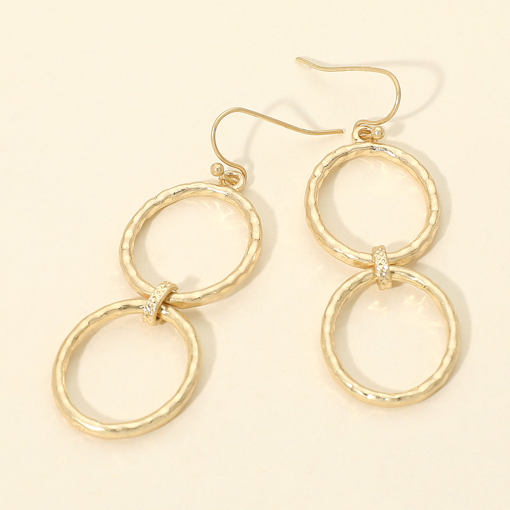 • Elegant double oval ring drop earrings designed with a softly textured finish for subtle movement and visual interest. The linked open-ring silhouette creates a modern yet timeless look that transitions easily from casual outfits to dressy occasions. Lightweight and easy to style, these earrings are ideal for everyday wear, gifting, and boutique jewelry collections.