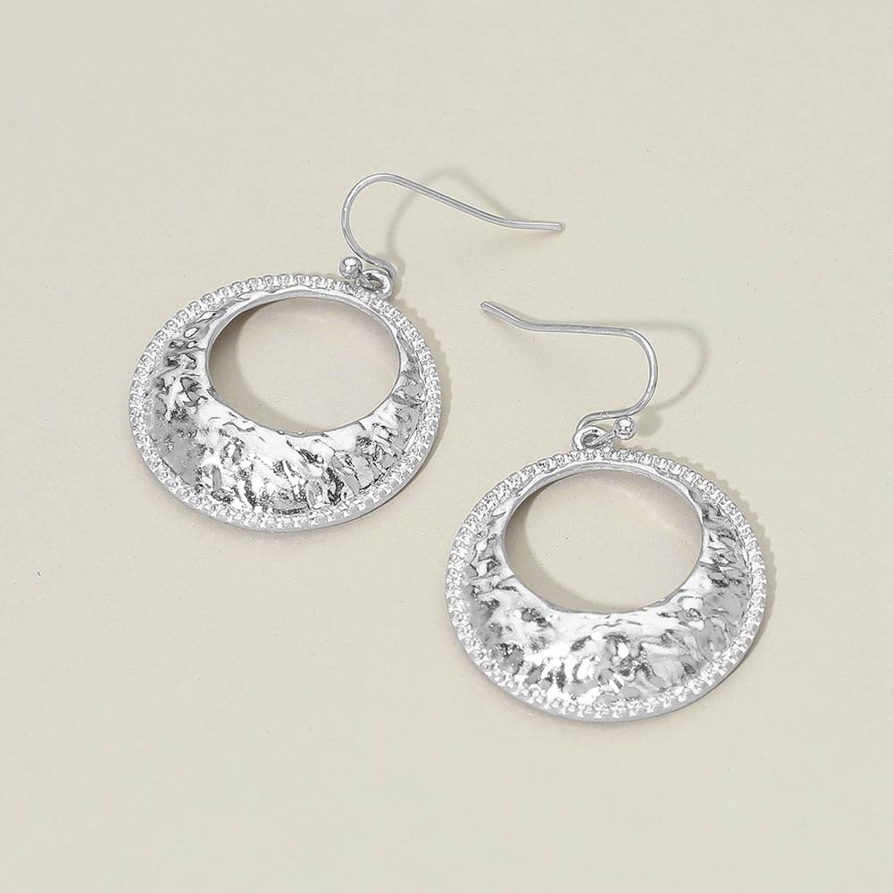 Details • Size : 1.1" X 1.5" • Fish Hook Back • Add modern elegance to any look with these textured open circle drop hook earrings. Designed with a sculpted surface and open center, they offer eye catching dimension and graceful movement. Lightweight and easy to wear, they transition seamlessly from everyday outfits to evening styling, making them a versatile choice for boutiques and trend focused collections. • Lead and Nickel Compliant