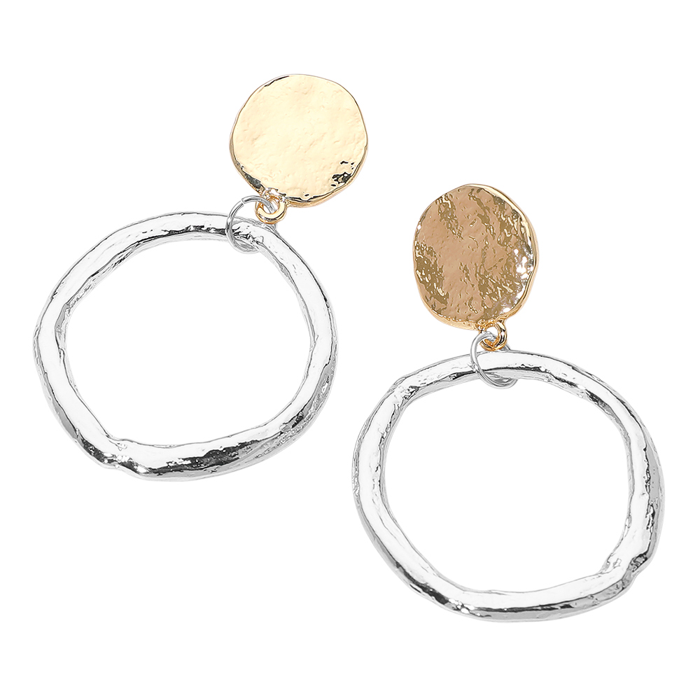 Details • Size : 1.6" X 2.5" • Post Back • Hammered circle drop earrings feature a textured round stud paired with an open hoop silhouette for modern movement and eye-catching style. Designed to complement casual outfits or elevated looks, they deliver bold impact with versatile appeal for everyday wear or special occasions. • Lead and Nickel Compliant