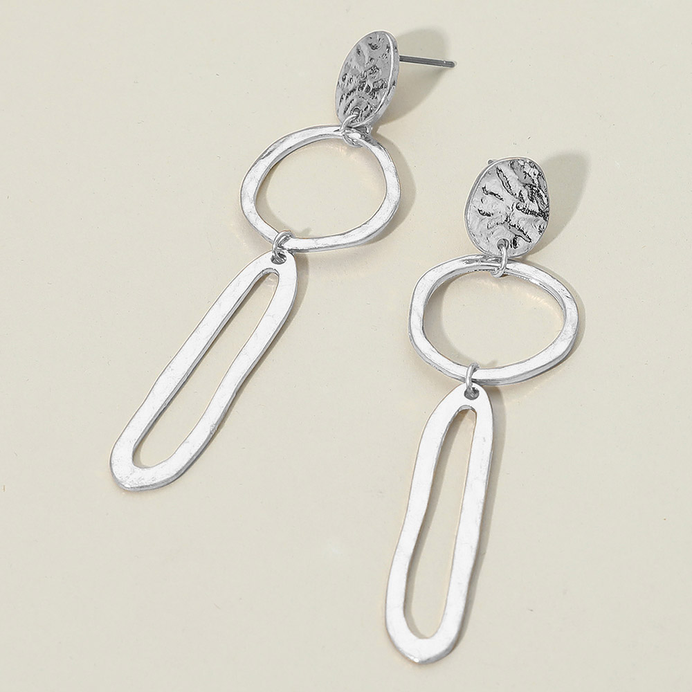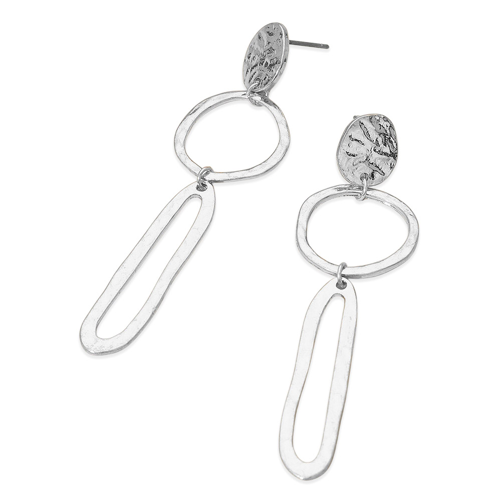 Details • Size : 0.8" X 2.75" • Post Back • Contemporary drop earrings featuring layered linked shapes with subtle textured detailing for an artful, modern look. Designed to create fluid movement and visual interest, these statement earrings elevate casual outfits and polished ensembles, making them a versatile choice for trend-forward styling and curated accessory collections. • Lead and Nickel Compliant