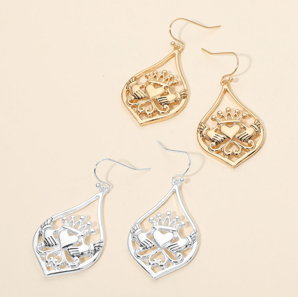• Elegant drop earrings featuring a classic claddagh-inspired design with heart, hands, and crown details. A symbolic style representing love, loyalty, and friendship, perfect for everyday wear, gifting, or boutique assortments seeking meaningful and timeless jewelry designs.