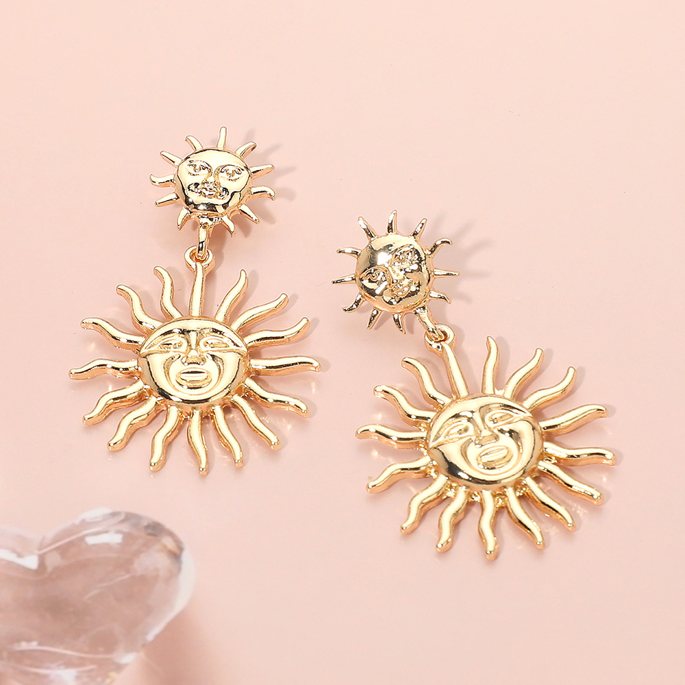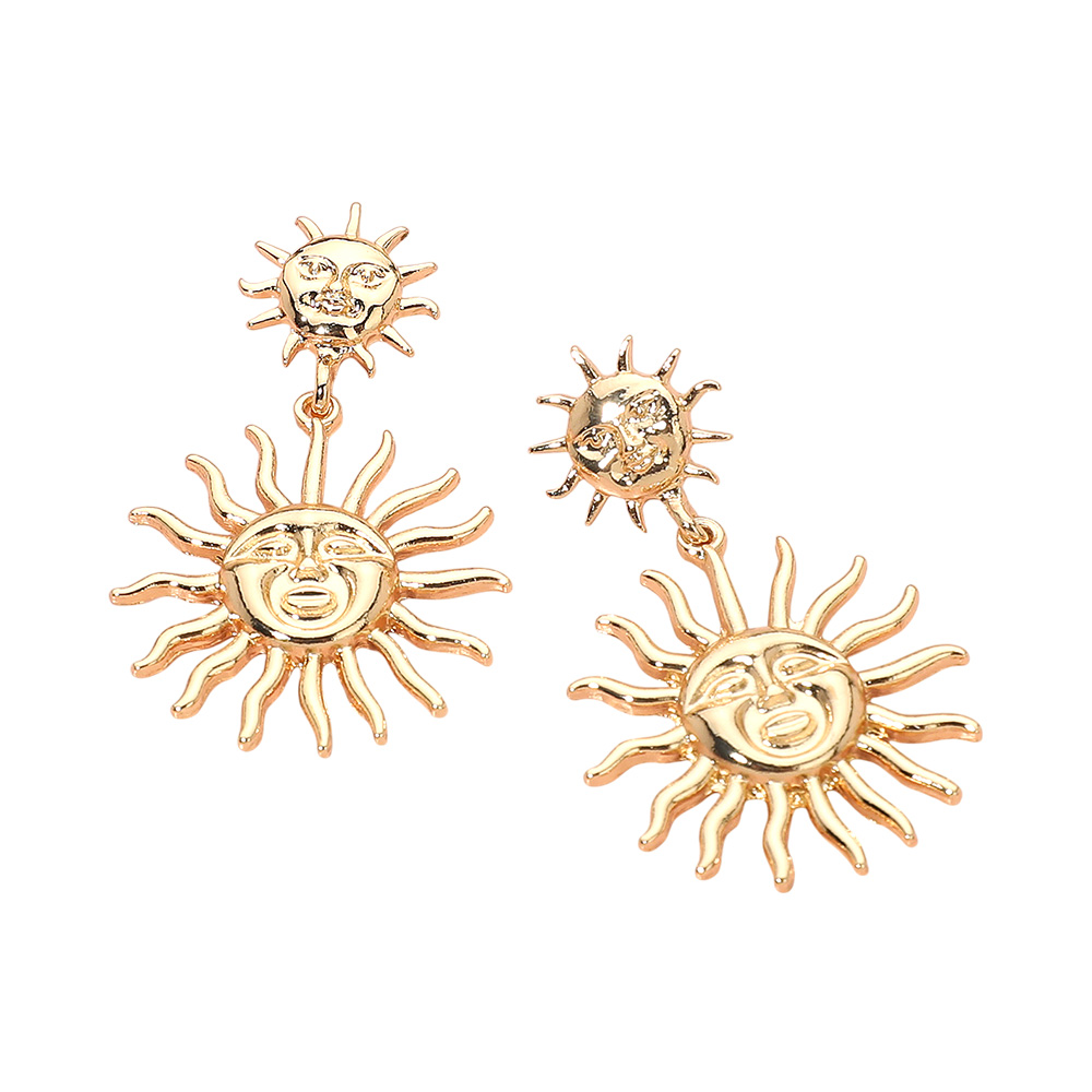 Details • Size : 1.25" X 1.8" • Post Back • Bold sun face drop earrings featuring radiant rays and detailed facial accents. A statement accessory that adds celestial charm and artistic flair to your look, perfect for festivals or standout style. • Lead and Nickel Compliant