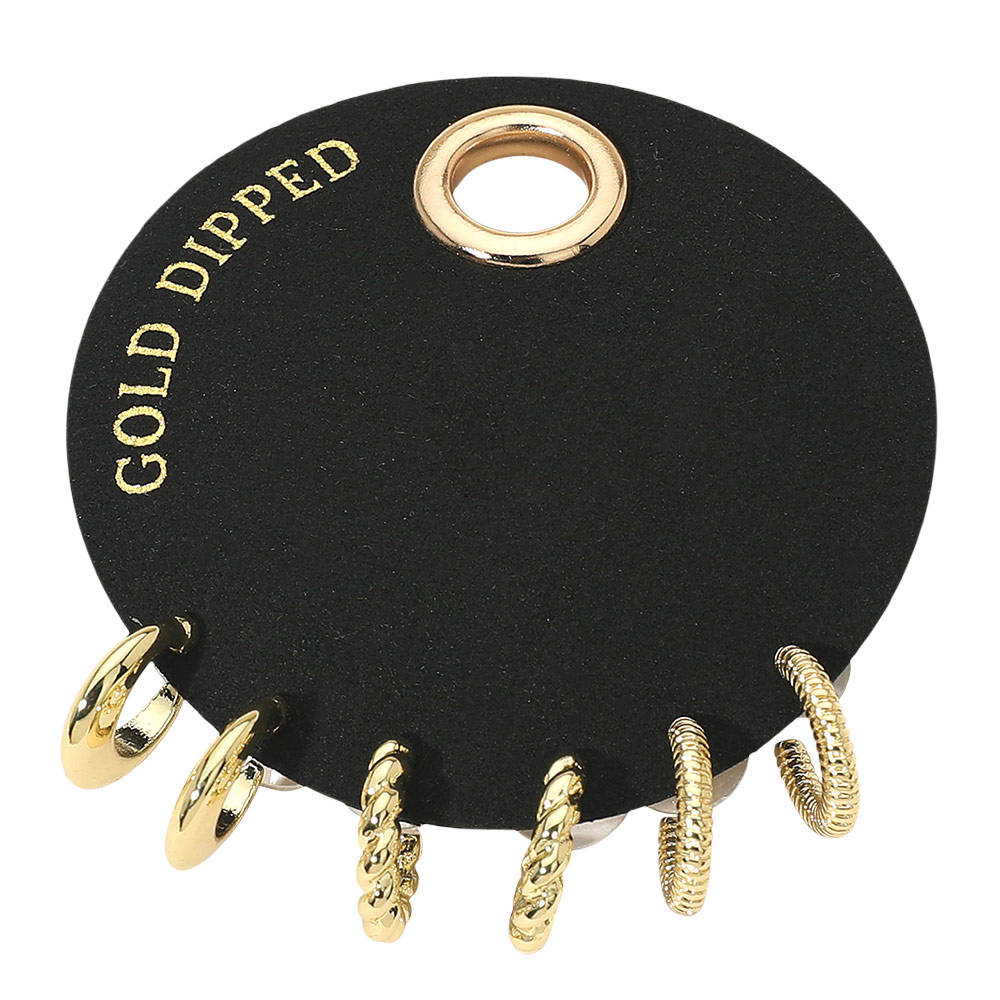 Details • Size : 0.6" L • Post Back • Versatile hoop earring set featuring a variety of smooth and textured designs for effortless everyday styling. Designed to mix and match easily, these hoops add subtle shine and dimension to casual looks, workwear, and special occasions, making them a must-have staple for boutique accessory collections. • Gold Dipped
